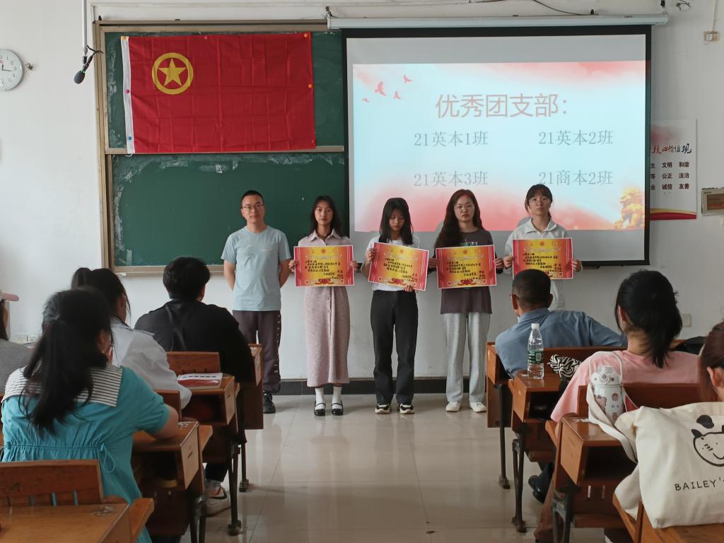 大会初始,由办公室主任进行考勤,确保学干们准时到达会场。紧接着,进入颁奖环节,主持人宣布文明班级、优秀团支部、“学雷锋”主题征文活动获奖情况,并分别由刘书记、冷全宝老师、团委副书记毕鑫为他们颁发奖状并合影留念。随后,由刘书记上台致辞。首先,他肯定了学干们在文明创建活动中的积极作为并给予表扬。同时也强调员工干部无论是在学习中或生活中,都应该有所作为、敢于担当,充分发挥先锋带头作用。他还呼吁大家要多参加学院组织的活动,努力提升自我,争取一起把外院的工作做到最好。同学们也表示将谨遵书记教诲,在日常生活中树立良好的学习榜样。接着,由冷全宝老师带领大家深入学习“党的二十大精神”。在致辞中,他强调我们作为员工干部应该把个人价值和国家相结合,深入贯彻学习党的二十大,并提倡各位学干们多参与二十大相关的活动。最后,由员工会主席李闫潇对会议进行补充。首先,她向大家强调了放假期间有关假条与晚归的纪律问题,提醒大家应该起到带头作用,遵守学校的规章制度。同时,她也鼓励大家认真学习,在面对即将到来的期中考试中能取得好成绩。最后,她希望大家共同努力发挥自己的优势,一起共建更美好的外院。本次大会到此结束。