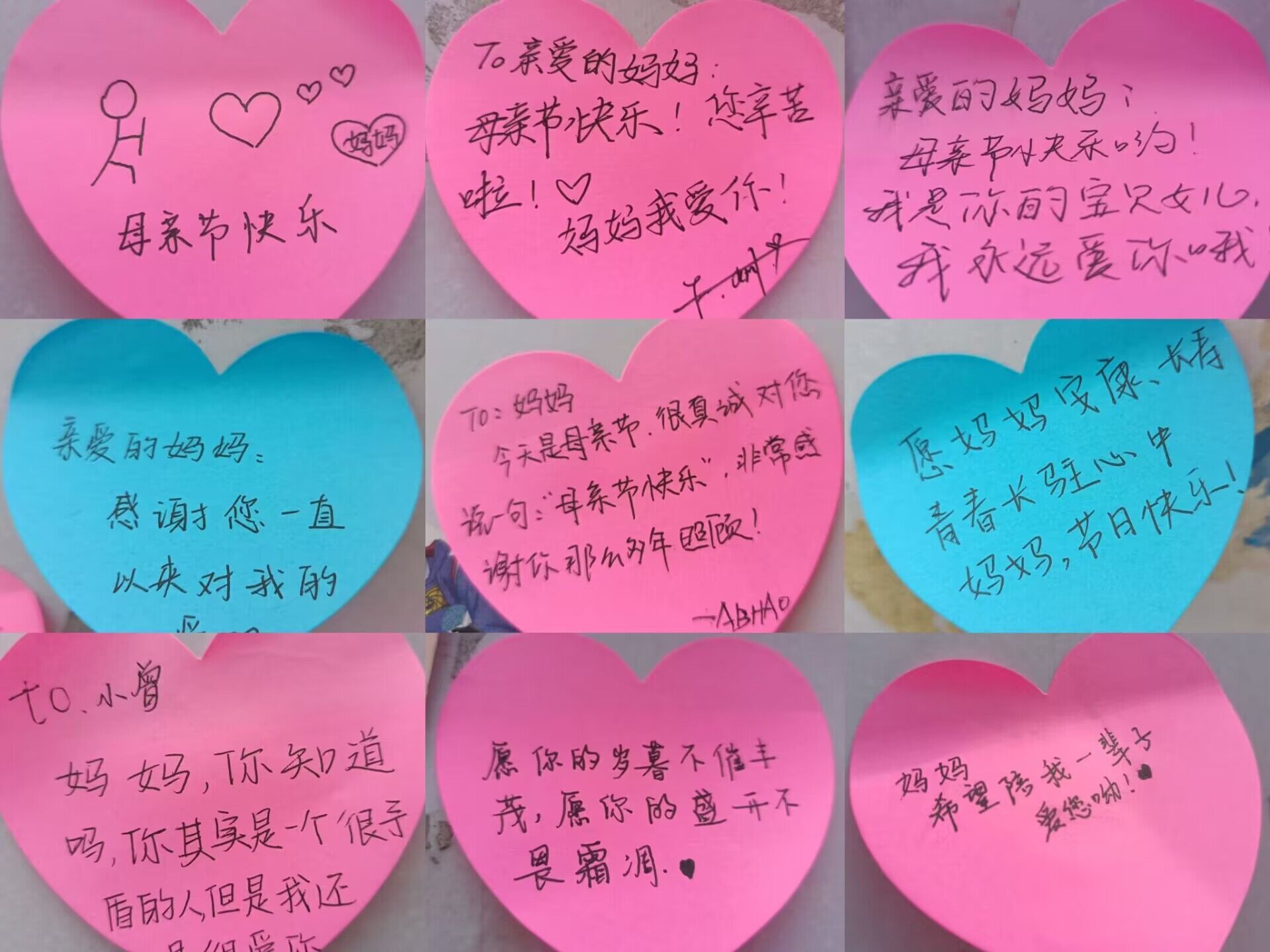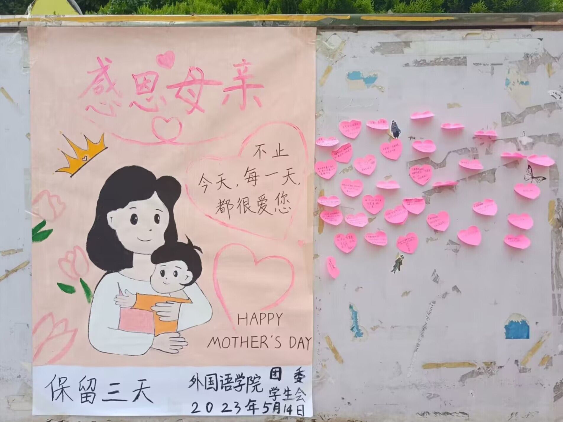 活动初始,全体工作人员早早地来到指定场地进行现场布置,将活动展板、便签摆放好后,对过路的行人进行宣传,向他们介绍此次活动的形式,即通过书写便签、拨打电话、发送短信向妈妈们表示美好祝愿,为妈妈们送上母亲节的祝福。为让活动能够更加有序地进行,本次活动实行轮班制,值班的工作人员将桌上的便签分发给前来参与活动的同学们,让他们将想对母亲说的话写在便利贴上,随后再粘贴至公告栏。在活动进行的过程中,参与活动的成员们都十分热情积极,将对妈妈的爱意直接地表达了出来。他们在便签纸上写下温暖的话语、在电话里说着“母亲节快乐”、在对话框中打出一个个爱心,这些是他们表达爱意的形式。随着活动的进行,参与活动的同学们越来越主动积极,展板上贴着的便签也越来越多,小小的一张便签、简短的几个句子,却充满了大家对母亲的爱意。母爱是伟大的,也是无私的,它沉浸于万物之中,充盈于天地之间,我们总能感受的它的存在。我们都具有爱人的能力,也都能够学着表达出来,一句“我爱你”,便能让妈妈们开心很久,思念无声但文字有情。最后,活动接近尾声,工作人员向在场的同学们表示真挚的感谢,并收获了大家的支持与一张张笑脸,在所有器材收拾完毕后,此次活动到此圆满结束。