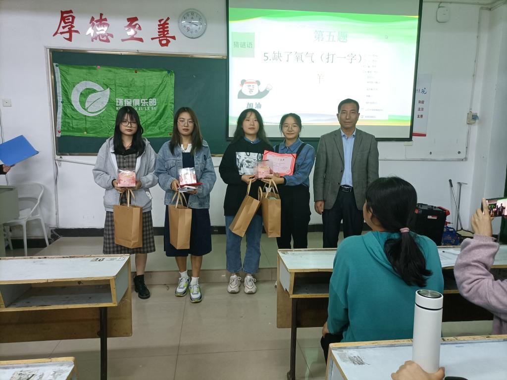 本次比赛共有17位选手,将其分为三大组进行比拼。比赛开始前,先由主持人介绍此次比赛内容,随后每大组分别通过PPT形式对作品进行展示和讲解,再由评委给每组选手打分。后一组介绍完作品会同时公布前一组的参赛者成绩,同时进入有趣的观众互动环节。主持人宣读完题目之后,观众开始举手抢答,赛场气氛活跃,不仅是参赛选手,在场每个人都通过共同参与答题对保护地球、爱护环境的相关知识有了更深的了解。在所有选手讲解完海报作品,评委宣布完分数之后进入颁奖环节,由指导老师及嘉宾向获奖者颁发荣誉证书及奖品。最后,主持人宣布此次活动圆满结束。