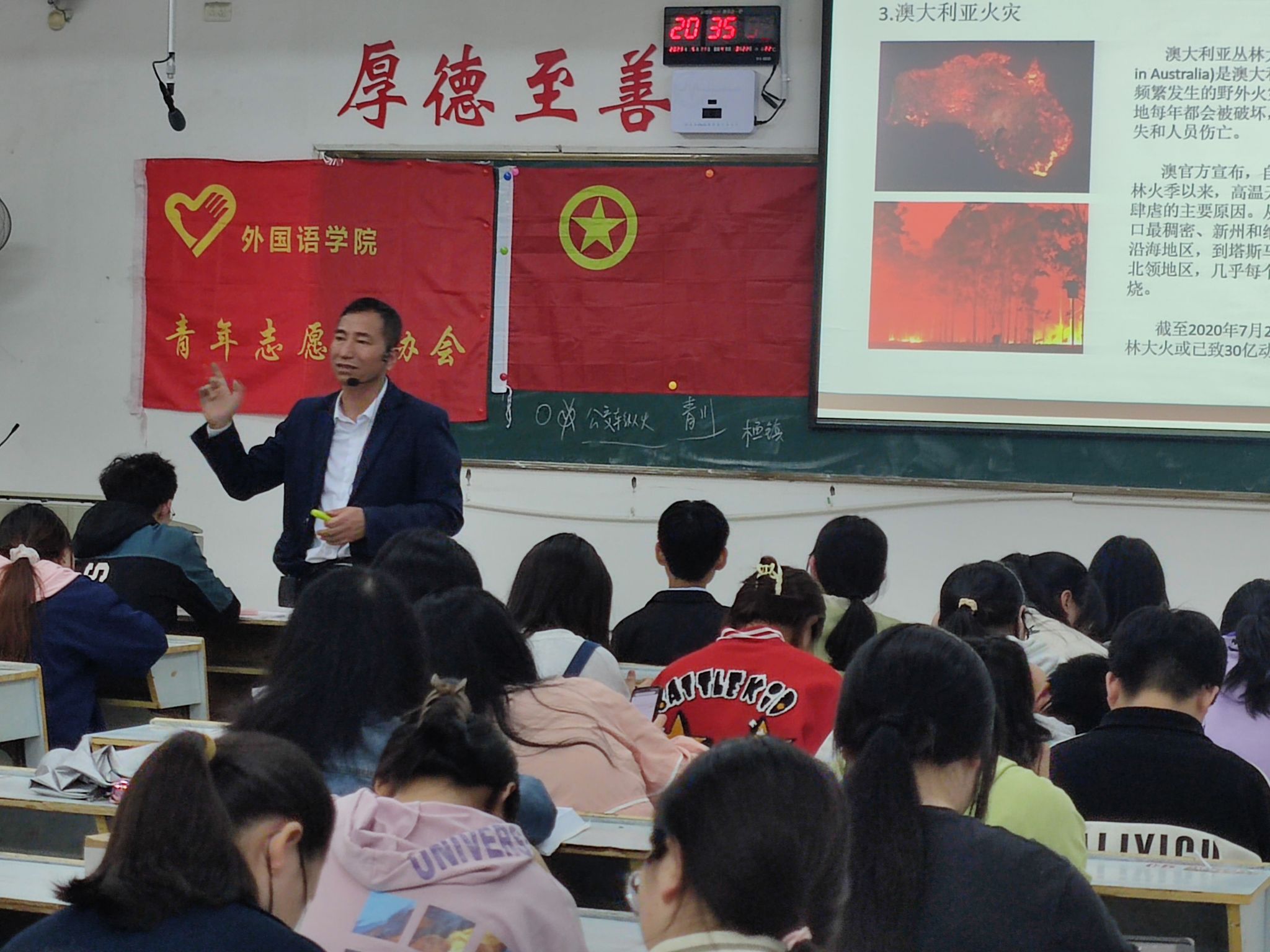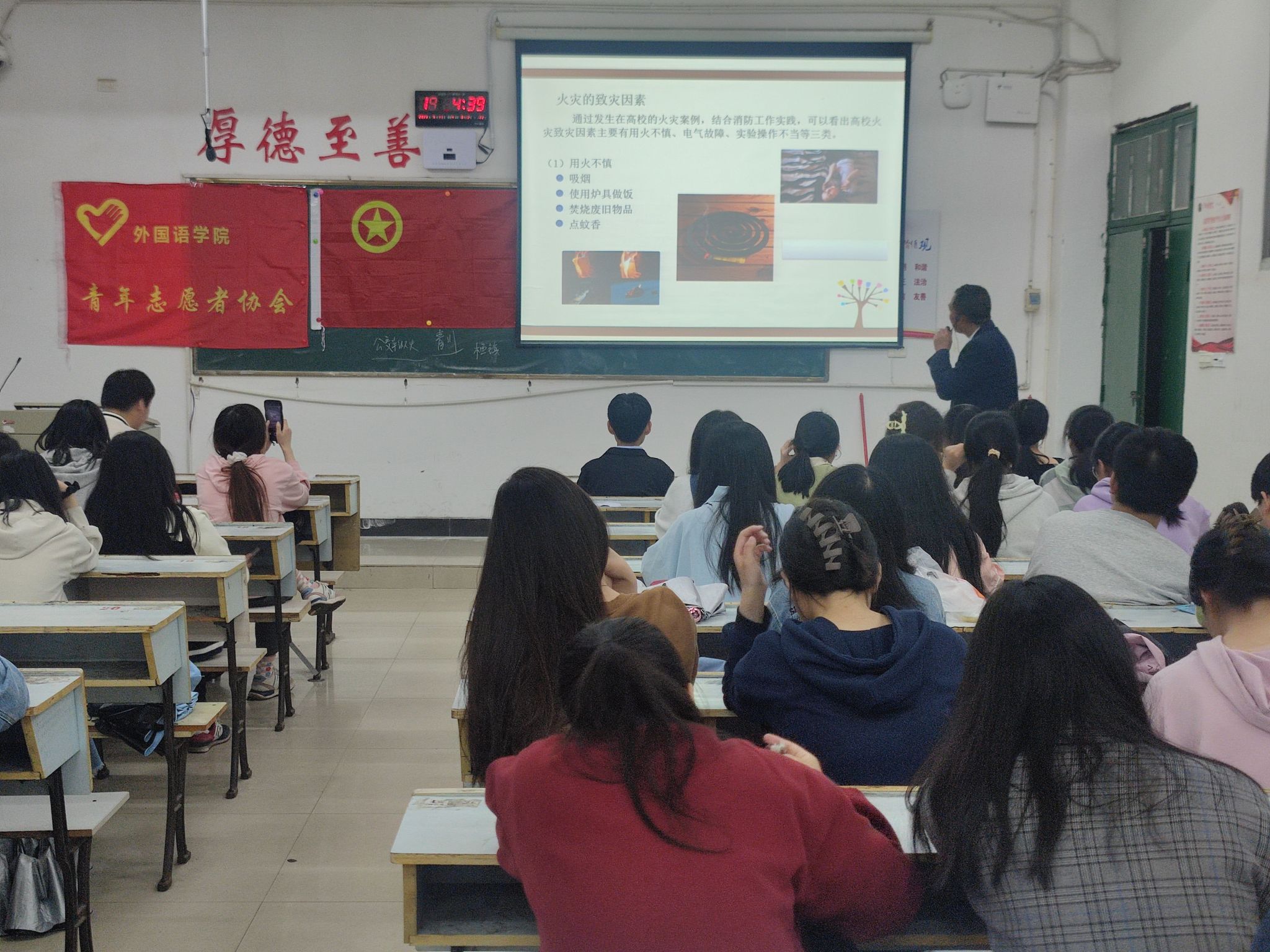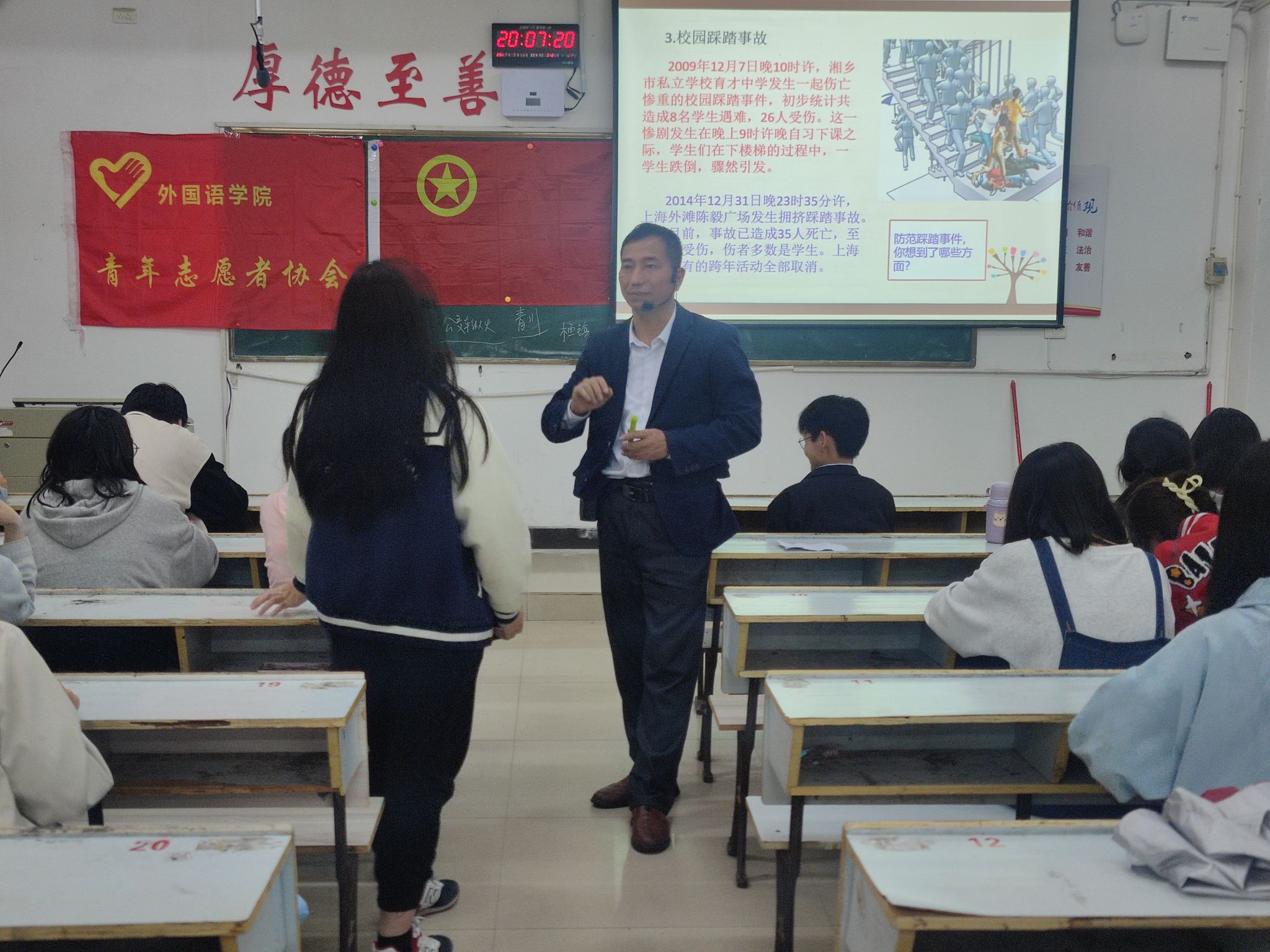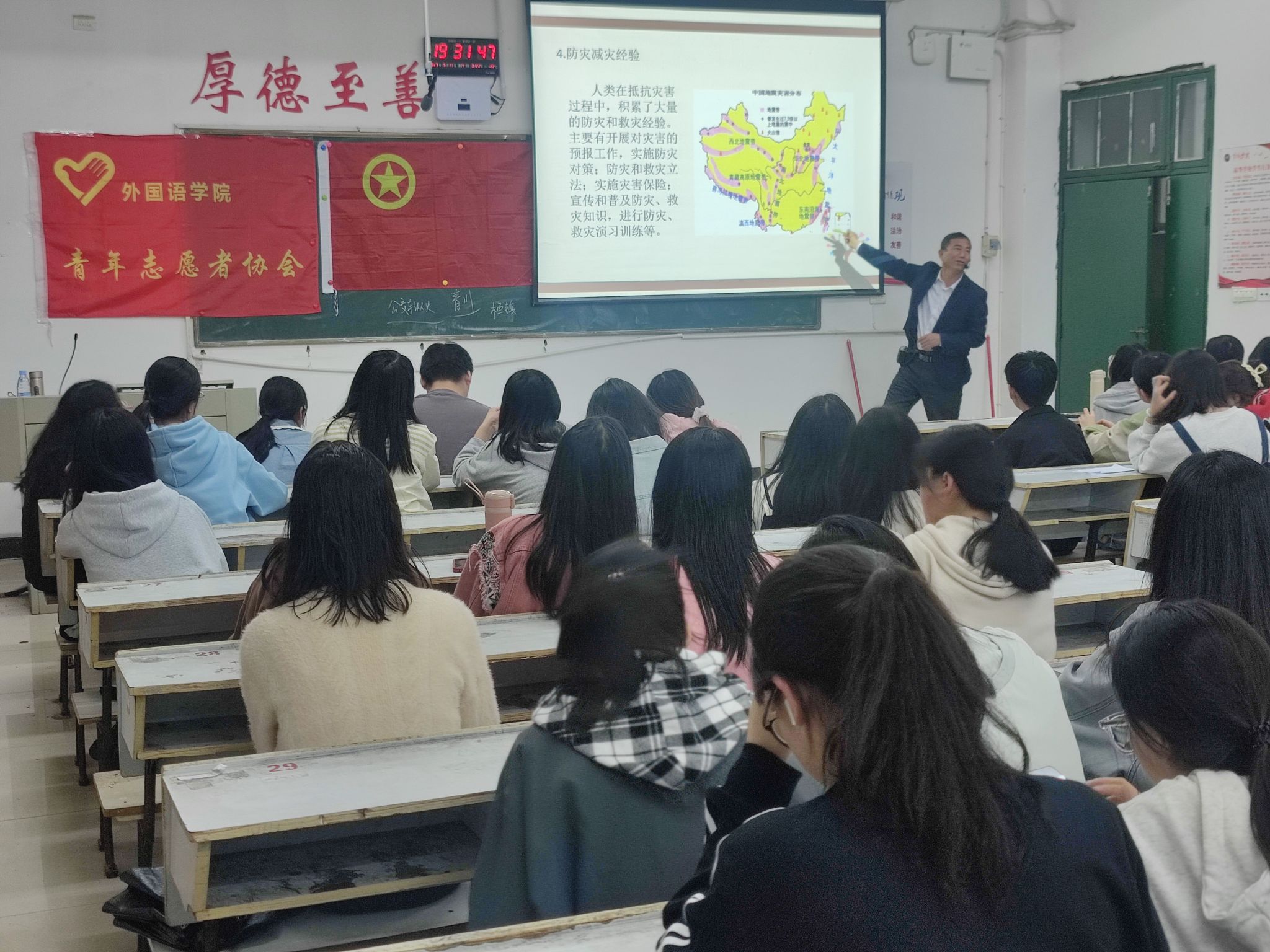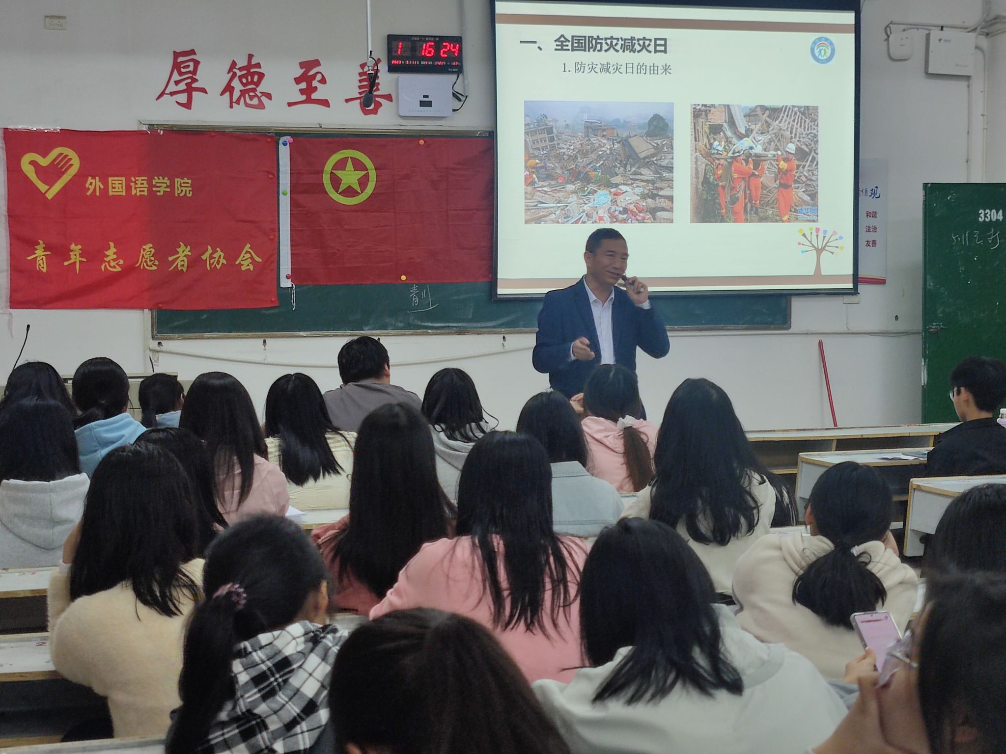 为了迎接第15个全国防灾减灾日的到来,让员工进一步学习防灾减灾知识,增强忧患意识,提高防灾避险能力,化解重大灾害风险,beats365亚洲版官网青年志愿者协会于2023年5月11日19:10在英华楼3304举办了“防范灾害风险,护航高质量发展”讲座活动。活动的主办方为beats365亚洲版官网“昱辉”志愿服务团,协办方为beats365亚洲版官网青年志愿者协会和beats365亚洲版官网心理工作站。参加此次讲座的嘉宾有beats365亚洲版官网心理工作站指导老师王卫民老师,beats365亚洲版官网“昱辉”志愿服务团、青年志愿者协会和心理工作站部分成员,英语2202班和商务英语2201班全体同学。