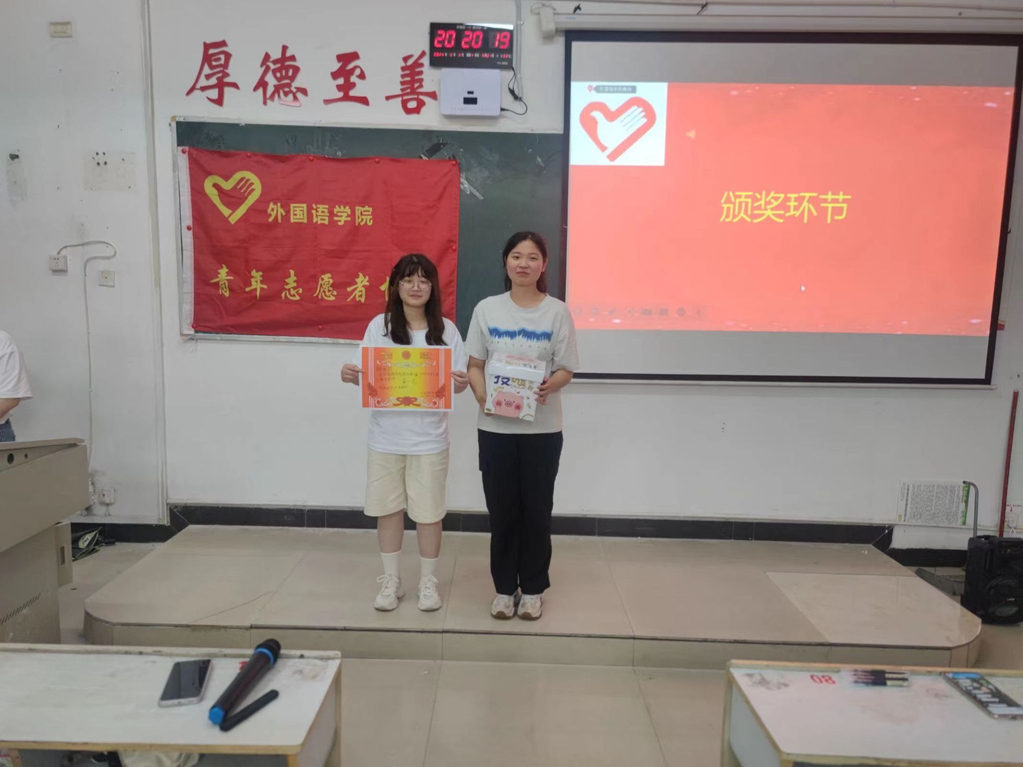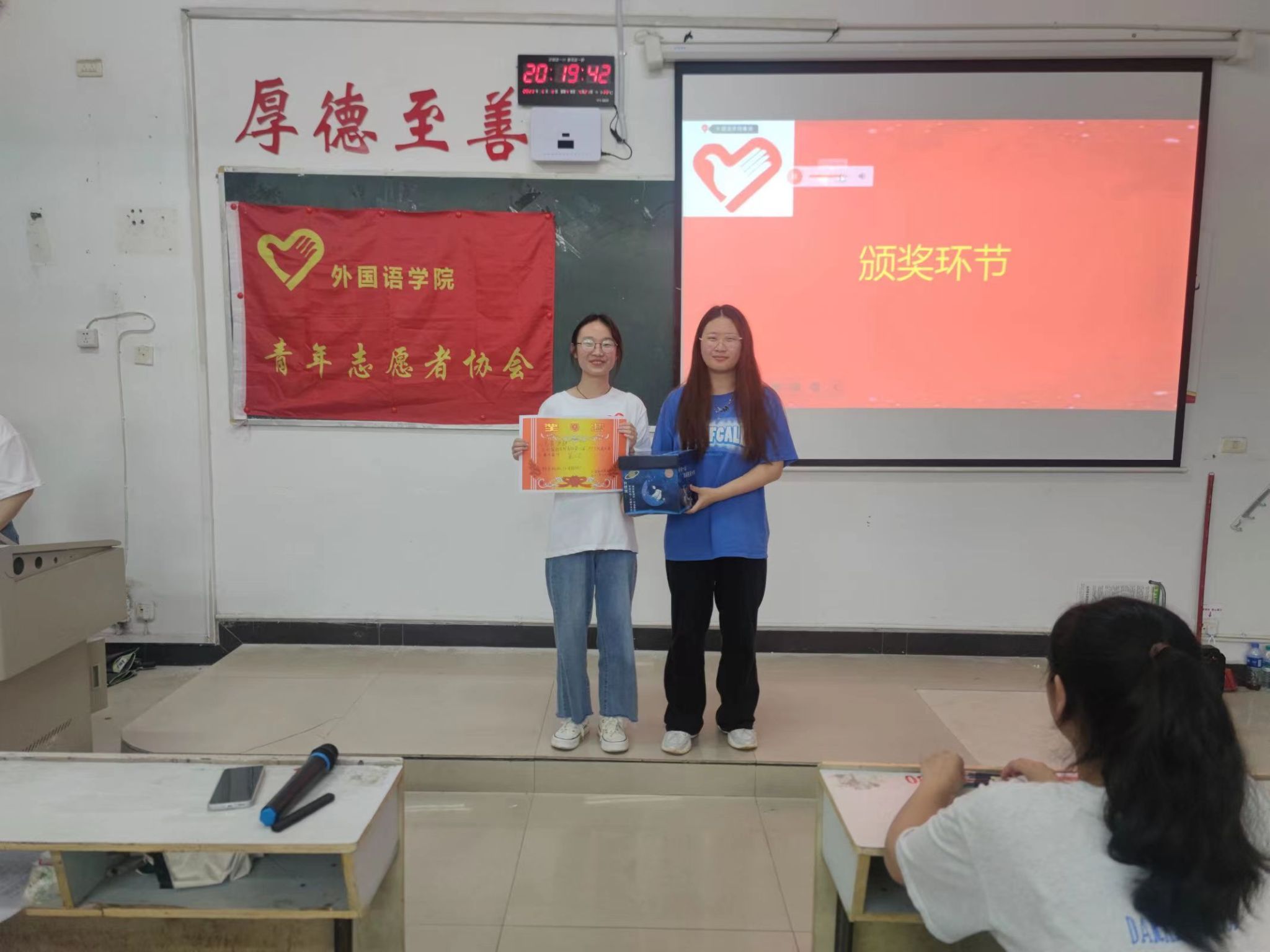首先,由主持人欧阳欢宣布活动开始。紧接着,由各个部门带来精彩的PPT展示和激昂有力的演说。每位汇报人站在台上讲述着他们与青协美好的点点滴滴,从中我们不仅能够了解到他们在青协留下的难忘的回忆,更能够体会到他们“山水一程,三生有幸”的留恋与不舍。前三个部门展示完毕后进入第一轮游戏环节,游戏结束后由主持人公布其成绩。后四个部门展示完成后进入第二轮游戏环节。在“手口不一”的游戏环节中,各位参赛选手用敏锐的反应速度展现出自己超强的实力,引得现场爆发一阵阵欢笑和掌声。在所有部门的PPT完成展示后,由工作人员配合评委进行最终的分数统计。接下来,由会长余钟晓发表讲话,会长对大家的表现给予了肯定,同时也对大家表达了美好祝愿,无论结果如何,希望大家都能够在青协有所收获且有一段难忘的回忆。最后,由主持人宣布获奖名单,获得一等奖的部门是新闻部,由会长余钟晓颁奖并合影留念,获得二等奖的部门是人力资源部,由副会长艾萌颁奖并合影留念,获得三等奖的部门是文宣部和组织部,由副会长汤雨涵颁奖并合影留念。至此,本次活动圆满结束。