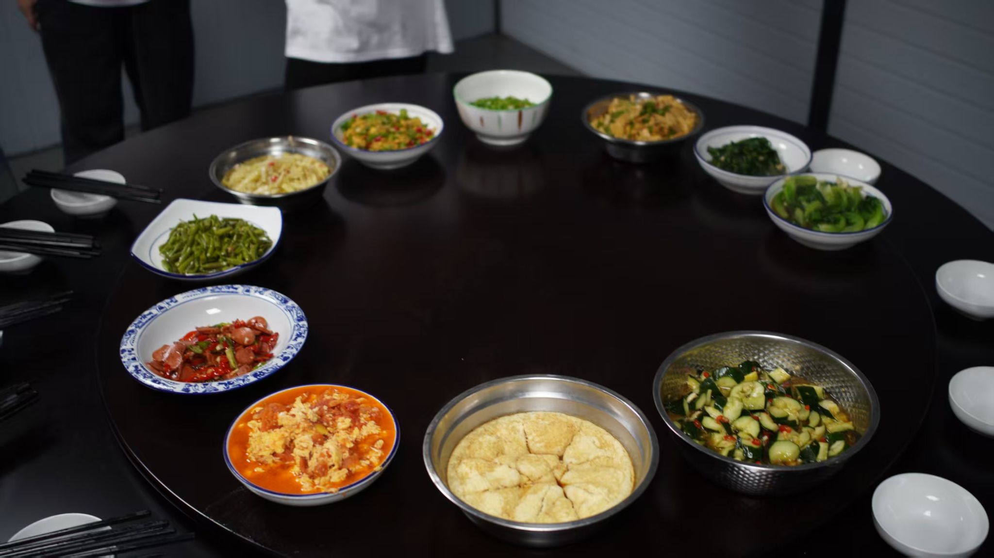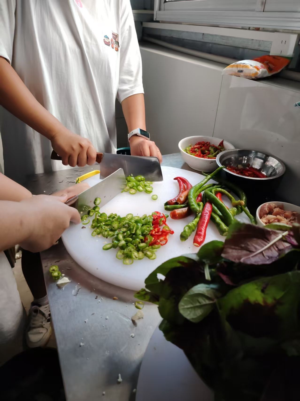暮色缓缓笼罩小村,雨势渐弱,厨房成了满是烟火气的温馨天地。老师与同学们各展厨艺,择菜的同学专注分拣,切配成员将土豆切成均匀细丝、把黄瓜拍打成适口块状,掌勺者则娴熟地起锅热油、调味翻炒。不久,清爽的清炒时蔬、酸辣的凉拌黄瓜与鲜香的紫菜蛋花汤等相继出锅,丰盛菜肴摆满餐桌。大家围坐而食,欢声笑语伴着饭菜香气在村庄里飘散。这场充满烟火气的协作,不仅凝聚了团队情谊,更承载着初到乡村的温暖与期待,为后续支教、助农、村志撰写等实践任务积蓄力量,让青春在乡村振兴的征程中绽放独特光彩。