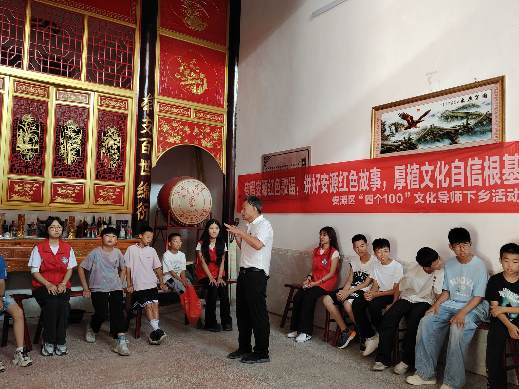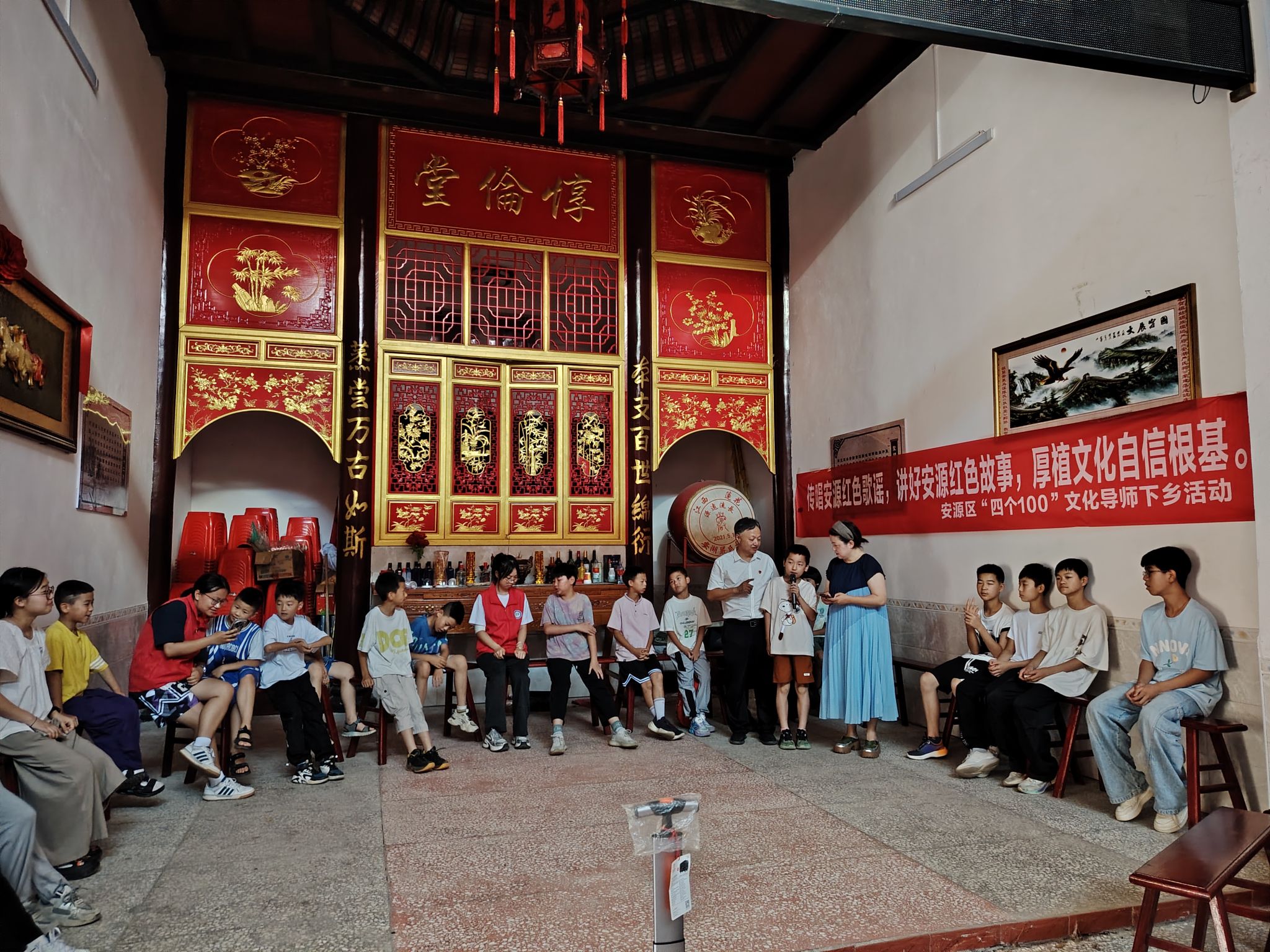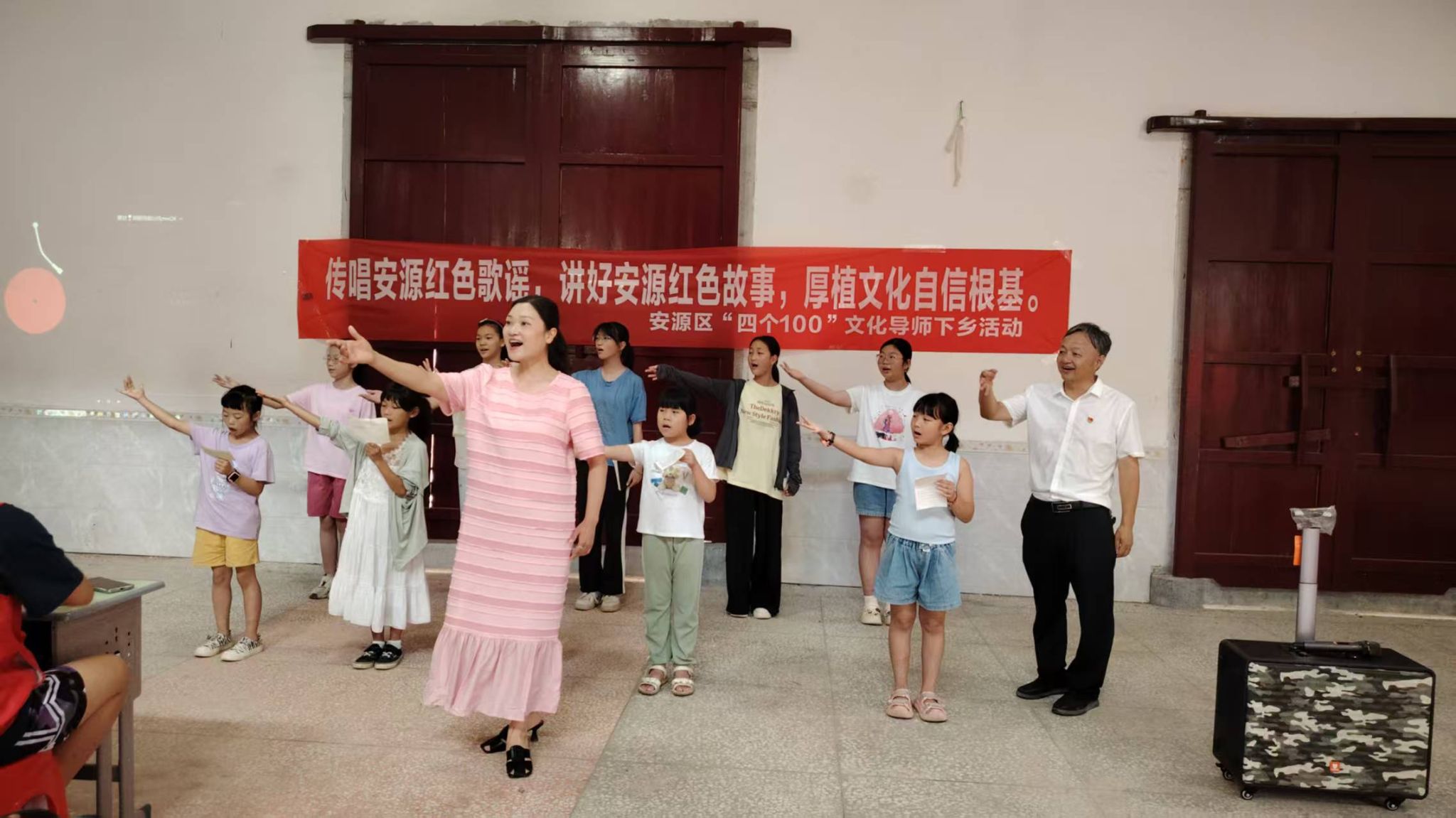 活动开始,糜文宇导师以“少年进炭棚”的经典歌谣为切入点,深入浅出地讲解了《张家湾的红灯》的历史背景和深远意义,诠释了语言工作者独有的讲述技艺,让革命故事焕发新的生命力。黄瑶老师将安源红色故事的丰富情节和深刻内涵娓娓道来,带领员工们“穿越时空”,见证先辈们艰苦卓绝的抗争;甘璐琼老师则通过现场演唱和教学,演示了歌谣独特的唱腔与方言韵味,让稚嫩而坚定的歌声在宗祠内回荡,传递着对革命先辈的缅怀与对红色精神的传承。