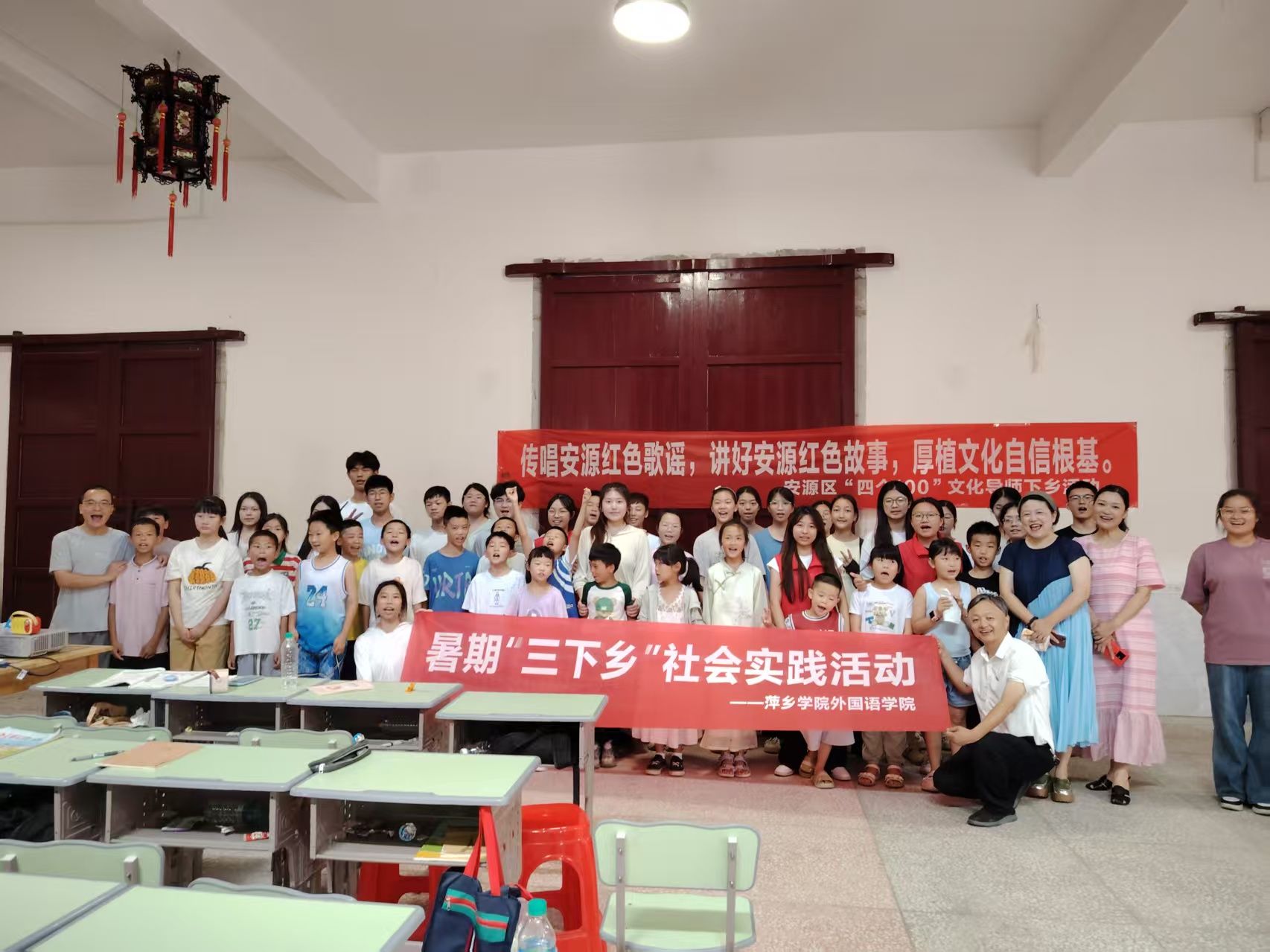 为推动文化人才与文明乡风双向赋能、双向滋养,2025年7月2日,在这个充满历史与文化底蕴的夏日,beats365亚洲版官网“萍外星光”志愿服务团的师生们携手萍乡市“四个100”文化导师,以红色非遗传唱为主题,聚焦于省级非遗项目安源红色故事与安源红色歌谣,在垭坞村开展“非遗润童心,乡韵筑梦行”暑期三下乡志愿服务活动,为垭坞村的孩子们带来一堂别开生面的红色非遗课。