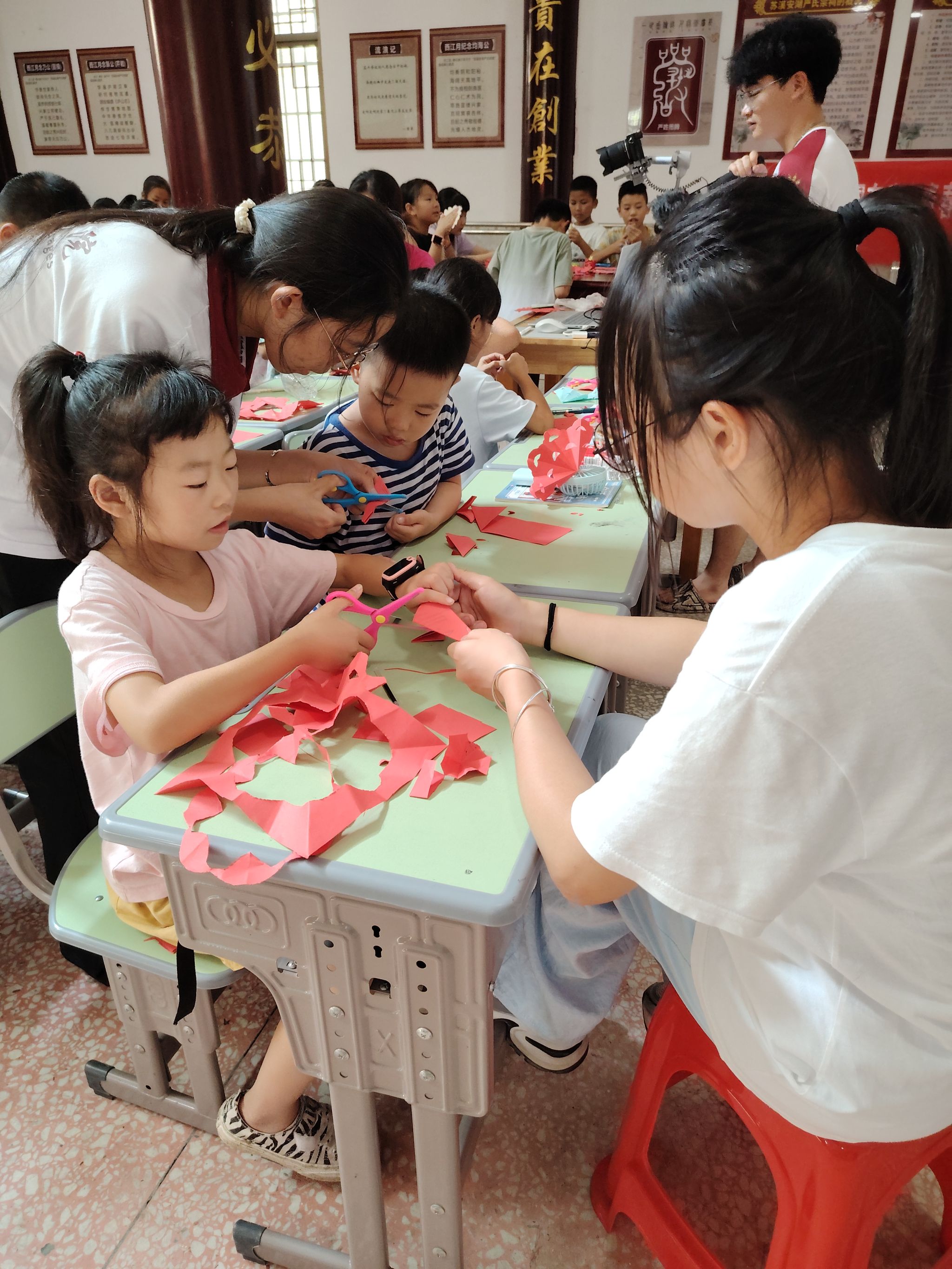 此次活动聚焦传统手工剪纸艺术,志愿者们带着精心准备的教学材料,与村里的孩子们齐聚一堂,共同开启这场充满趣味与意义的文化之旅。课堂上,志愿者老师以生动的语言向孩子们介绍剪纸艺术,讲述这门古老技艺如何通过一把剪刀、一张纸,创造出万千灵动图案。随后,老师为每位同学分发彩纸与剪刀,并展示PPT上清晰的剪纸步骤,从简单的对折、描线,到细致的裁剪,每一步都耐心讲解。孩子们全神贯注,小脸上满是好奇与认真,明亮的眼睛紧盯着屏幕,小心翼翼地模仿着操作。他们沉浸在剪纸的世界里,时而皱眉思考,时而展露笑颜。遇到困难时,身旁的志愿者们立即俯身协助,或帮忙折纸塑形,或手把手引导裁剪,现场氛围温馨又热烈。在大家的共同努力下,一个个充满童趣的剪纸作品逐渐成型。这场别开生面的剪纸非遗课堂,不仅让孩子们捧着亲手创作的精美作品欢呼雀跃,更如同一颗颗饱含希望的种子,深深埋进他们的心田,静待未来在传统文化的滋养下生根发芽,绽放出传承创新的绚丽之花。
