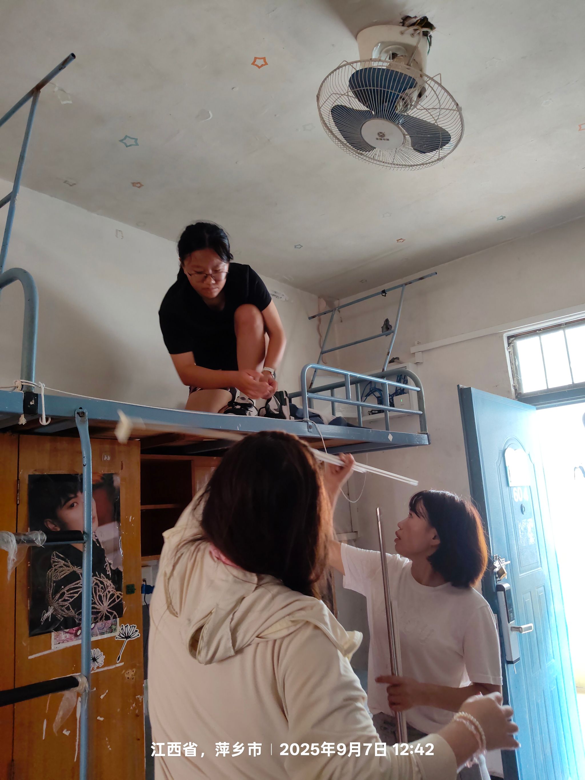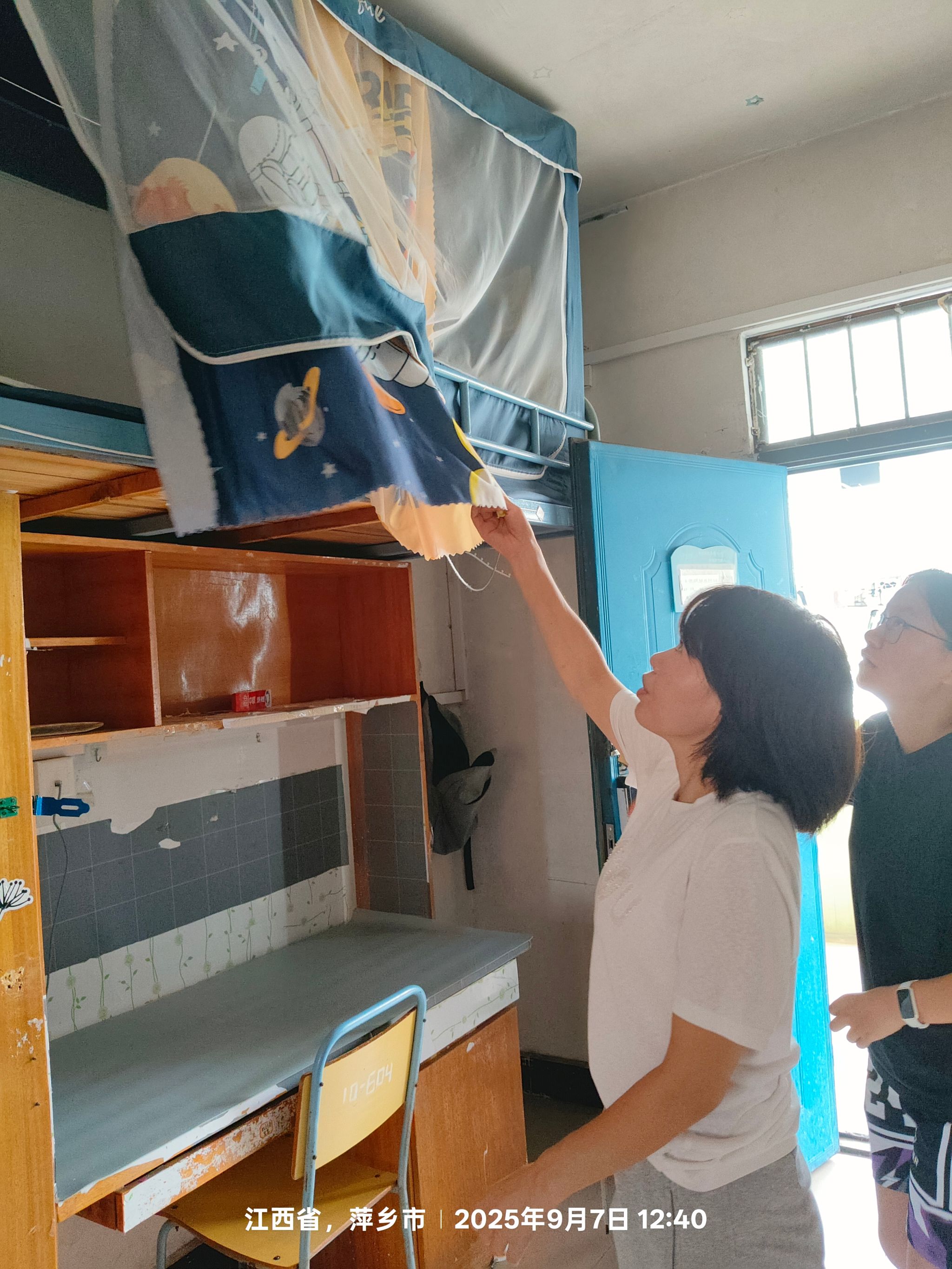 擦玻璃的同学则拿着沾有玻璃清洁剂的抹布,认真擦拭着每一块玻璃。他们先将玻璃表面的污渍擦掉,然后又用干净的干抹布把玻璃擦得锃亮,让窗外的光线能毫无阻碍地透进寝室。曹金萍老师也亲自参与到清扫工作中,她拿起抹布,仔细擦拭着寝室的书桌和衣柜。老师一边擦,一边和旁边的同学交流:“同学们,咱们擦的时候要仔细些,这些地方新生们很快就要使用了,得让它们干干净净的。”在老师的带动下,大家的干劲更足了。