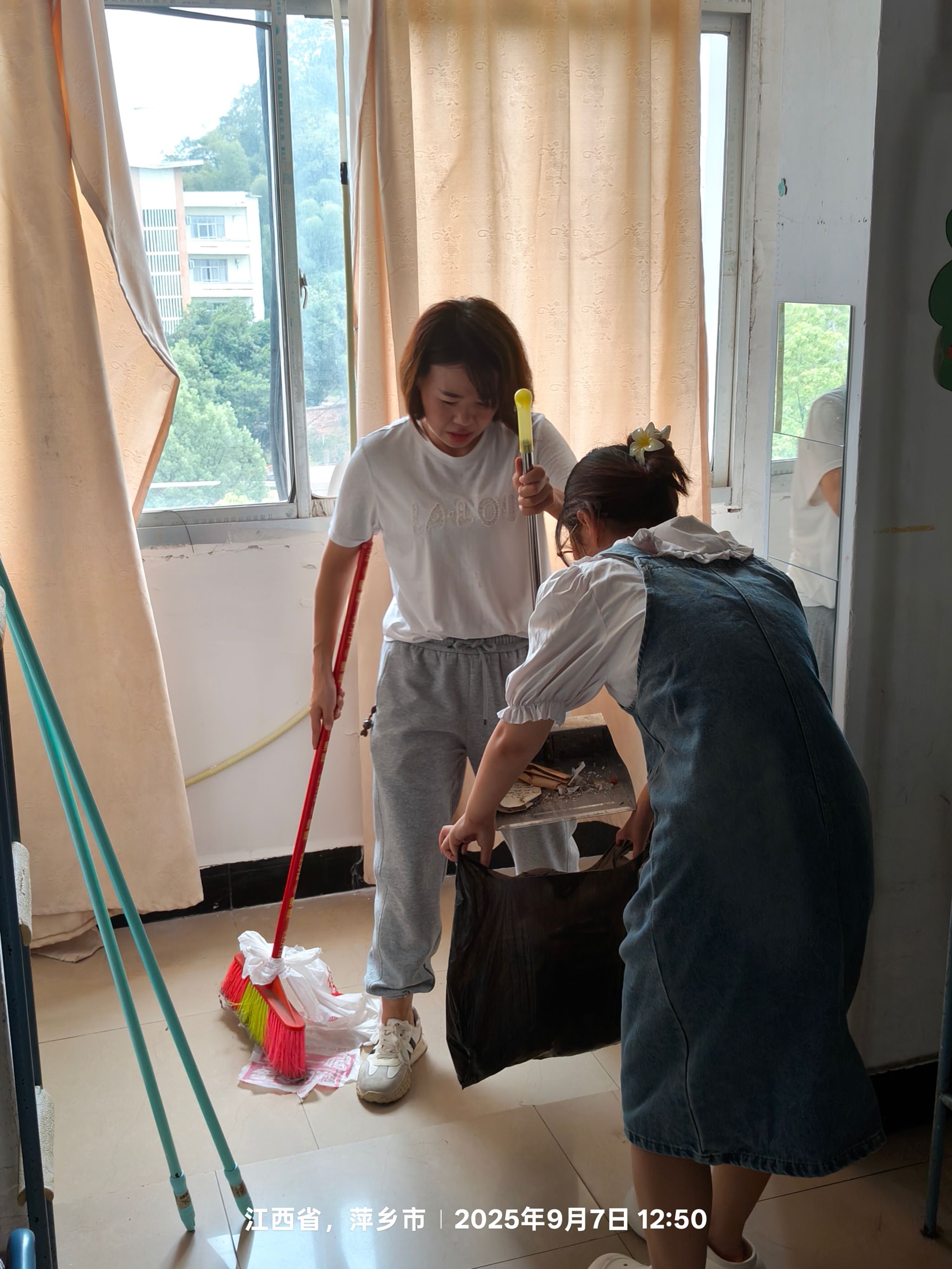 活动开始前,曹金萍老师组织召开了专门的工作部署会议。她强调,寝室是新生大学学习生活的重要起点,干净整洁的寝室环境不仅能给新生留下良好的第一印象,更能让他们在踏入大学校园的最初时刻,就感受到学院的关怀与温暖。曹老师详细安排了清扫任务,明确了不同区域的责任人员,从寝室的门窗、地面,到卫生间、阳台,都做了细致划分,确保清扫工作无死角。会议结束后,师生们迅速投入到准备工作中。大家准备好扫帚、拖把、抹布、玻璃清洁剂等各类清扫工具,带着饱满的热情前往新生寝室楼。来到寝室,师生们按照分工,立即忙碌起来。负责清扫地面的同学,仔细地用扫帚将地面的灰尘、杂物清扫干净,哪怕是角落缝隙里的细小垃圾,也不放过。之后,又用拖把反复拖地,直到地面光洁如新。