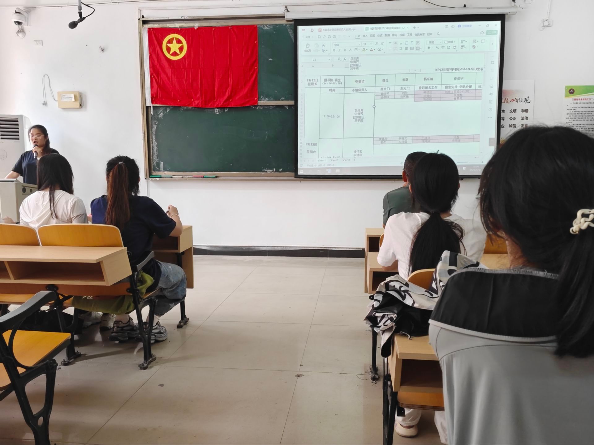 会议开始,员工会主席团助理张藜语细致拆解迎新流程,为迎新工作划定了每个人的工作安排。在流程安排上,她明确迎新当天将设置“校门口报到引导”“报到处资料审核”“生活区宿舍帮扶”三大核心岗位,每个岗位配备3至5名员工干部,要求全员提前熟悉流程、模拟演练,确保新生无需多跑、无需久等,“一站式”高效完成入学手续。服务层面,学院精心筹备迎新地图和手册,内含标注教学楼、食堂、图书馆位置的校园地图;同时特设帮扶提行李者,更针对家庭困难、行动不便的新生,安排专人一对一全程陪同,让新生倍感温暖。细节把控上,她强调全体志愿者需统一穿戴印有外院标识的短袖、穿好红色马甲,提前练习“同学你好,我是外院迎新志愿者”“有需求随时叫我”等礼貌用语,同时做好应对天气变化、人员拥挤等突发情况的预案,以规范化服务展现外院风貌。