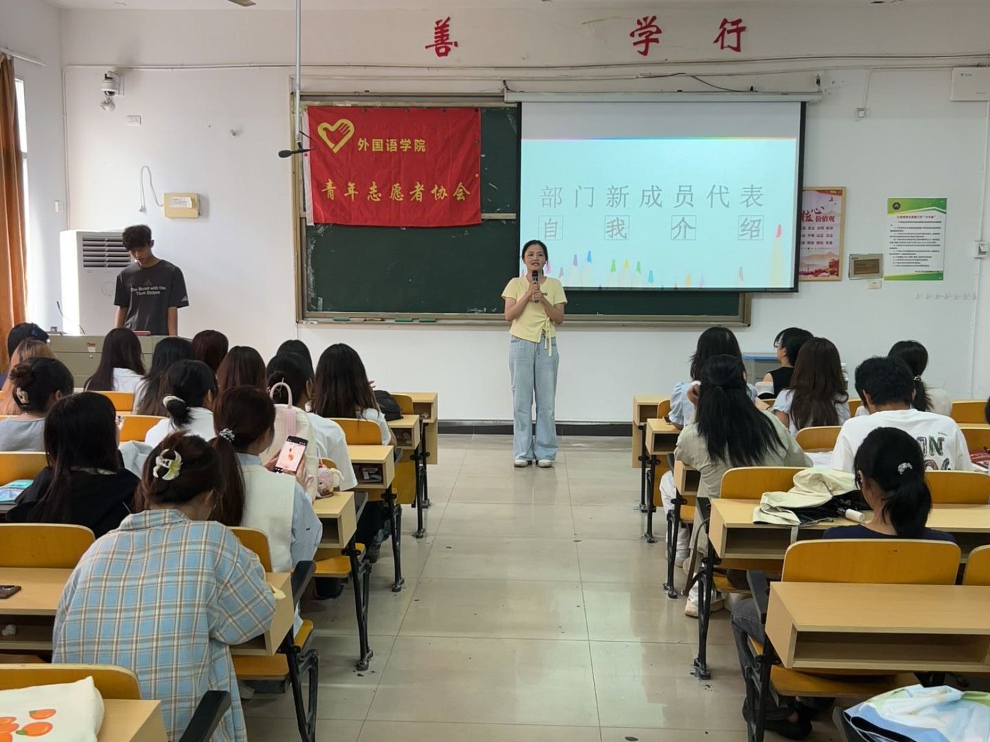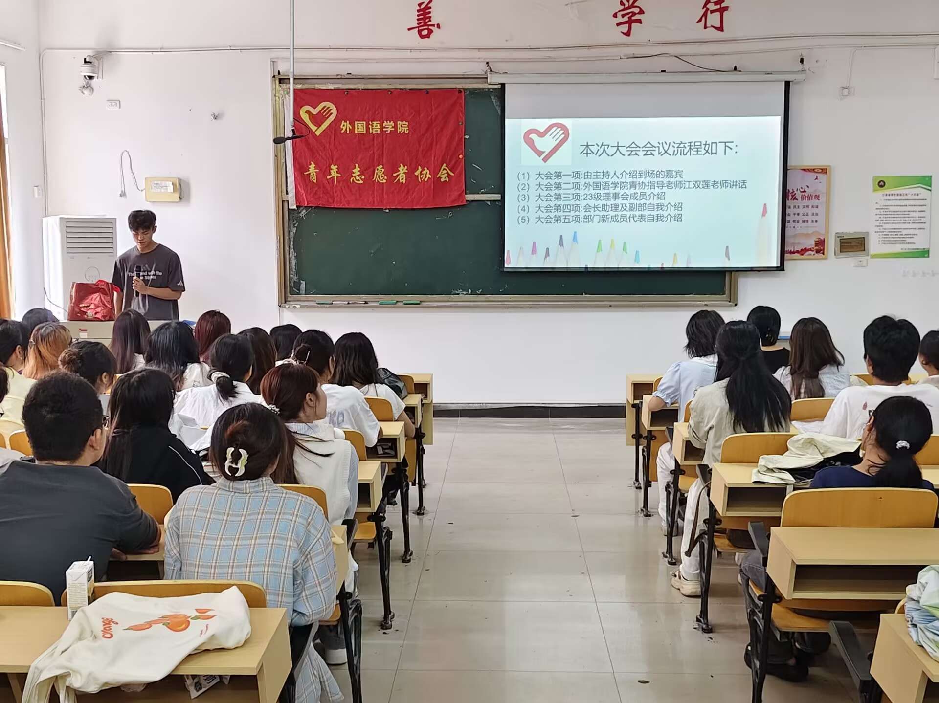 本次例会由会长朱嘉雨来主持。组织部进行考勤之后,进行第一项内容,会长朱嘉雨介绍了本次例会的流程和到来嘉宾。第二项是指导老师江双莲老师的讲话,江双莲老师先热烈欢迎新生加入外院青协这个大家庭,接着以自身经验引述大学期间应思考自己的目标,提前做好准备,并注重与同学,老师之间交往的礼貌性。第三项是23级理事会成员的简单自我介绍。第四项是24届理事会成员的简单自我介绍,以及分享自己过去一年的经验与想法。第五项是各部门新代表的自我介绍,他们表达了对后续志愿活动的期待与热情,展现了新成员的积极风貌。至此,例会圆满结束。