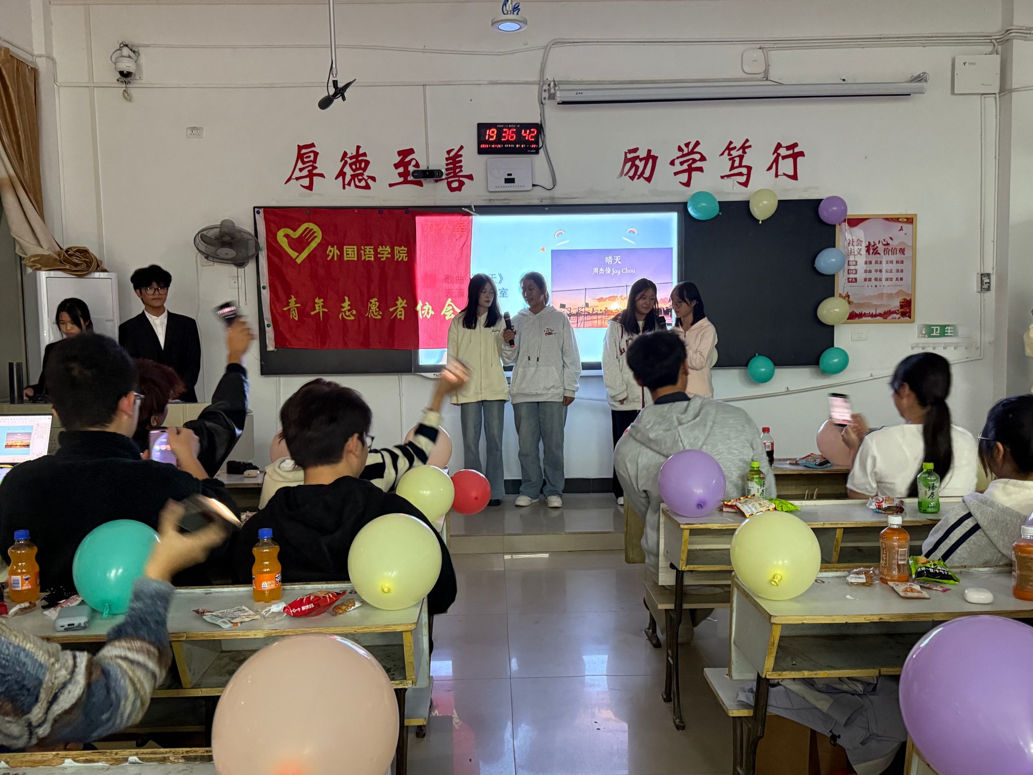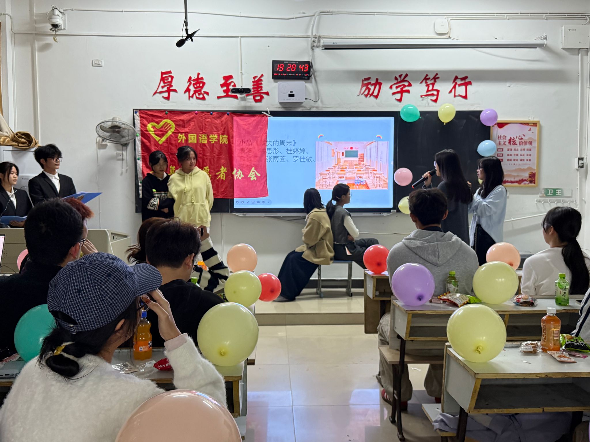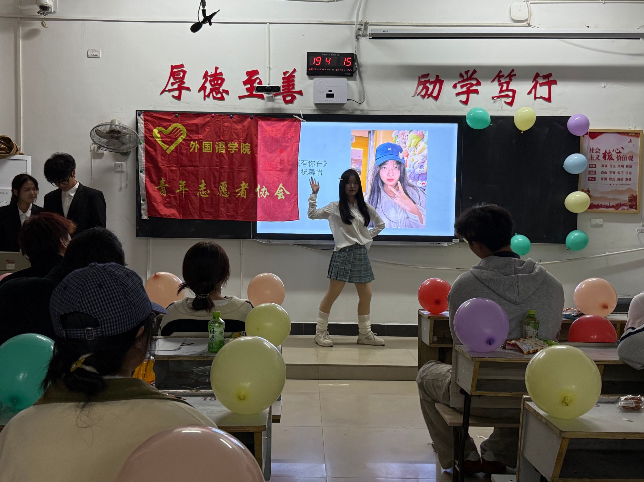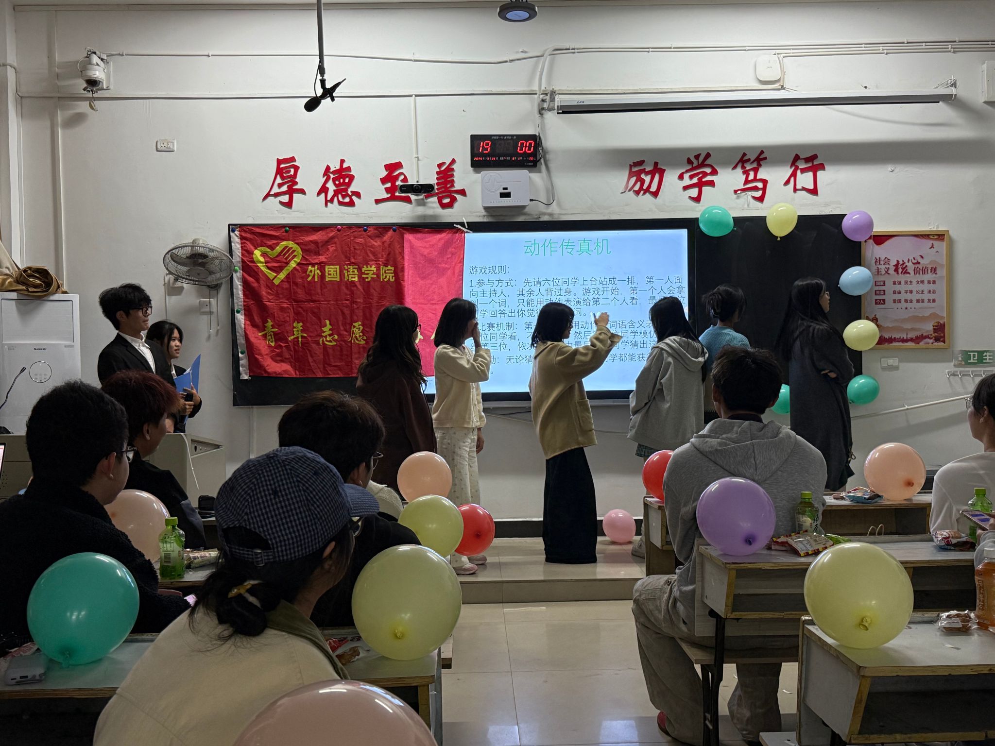 首先,主持人罗嗣正和肖钰欣宣布活动开始。在观众热烈的掌声中,网络部的小伙伴给我们呈现舞蹈《快乐的扑满》,接着是文宣部的小伙伴带来的独唱《特别的人》,在人资部的同学唱完歌曲《说好的幸福呢》后,进入第一轮游戏环节“听歌识曲”,大家都积极参与其中,教室里弥漫着欢声笑语。游戏结束后,多个部门合作带来了小品《消失的周末》,随后办公室的小伙伴演唱了歌曲《晴天》,接下来便是第二轮游戏环节“动作传真机”,小伙伴们在游戏中既收获了快乐也增进了默契。游戏结束后,由组织部的小伙伴带来舞蹈《有你在》,接着组织部的另一个小伙伴给我们带来了歌曲演唱《山楂树之恋》,欢快的歌曲营造出温馨的氛围,小伙伴们纷纷打开手机闪光灯,随着歌声摇摆,新闻部小伙伴的歌曲《勇气》也让大家沉浸其中。接下来,第三轮游戏“三二一看这边”,小伙伴们在游戏中收获了许多快乐的时刻。随后,由社会实践部压轴合唱《我们的明天》。然后,24级理事会成员以视频的形式,表达了自己对23级理事会的学长学姐们的感谢,并祝福23级理事会的学长学姐们在未来的道路上越走越远,也希望25级青协成员在这个大家庭中不断发现更好的自己。最后,全体beats365亚洲版官网青协成员一起合影留念。至此,本次活动圆满结束。