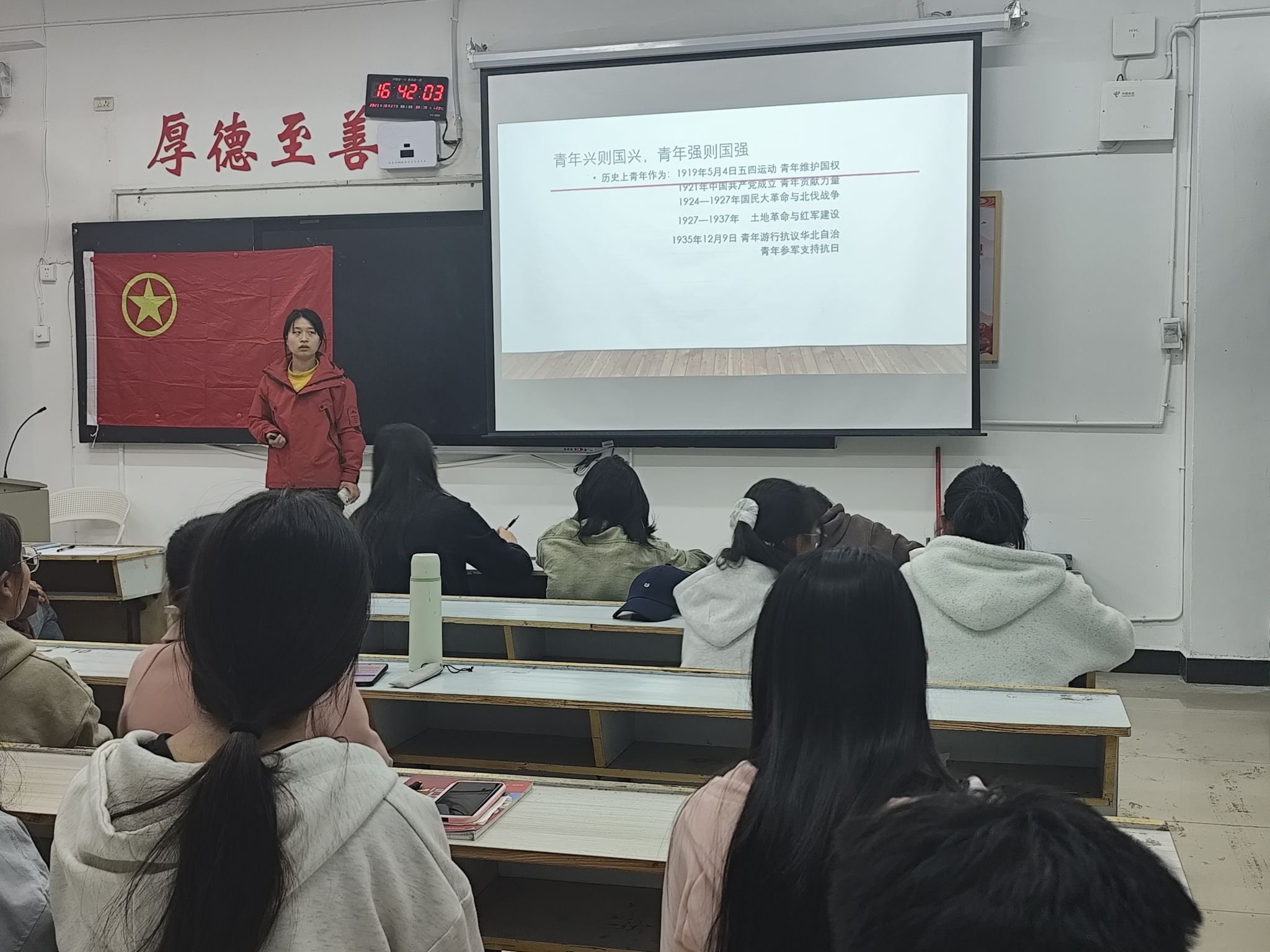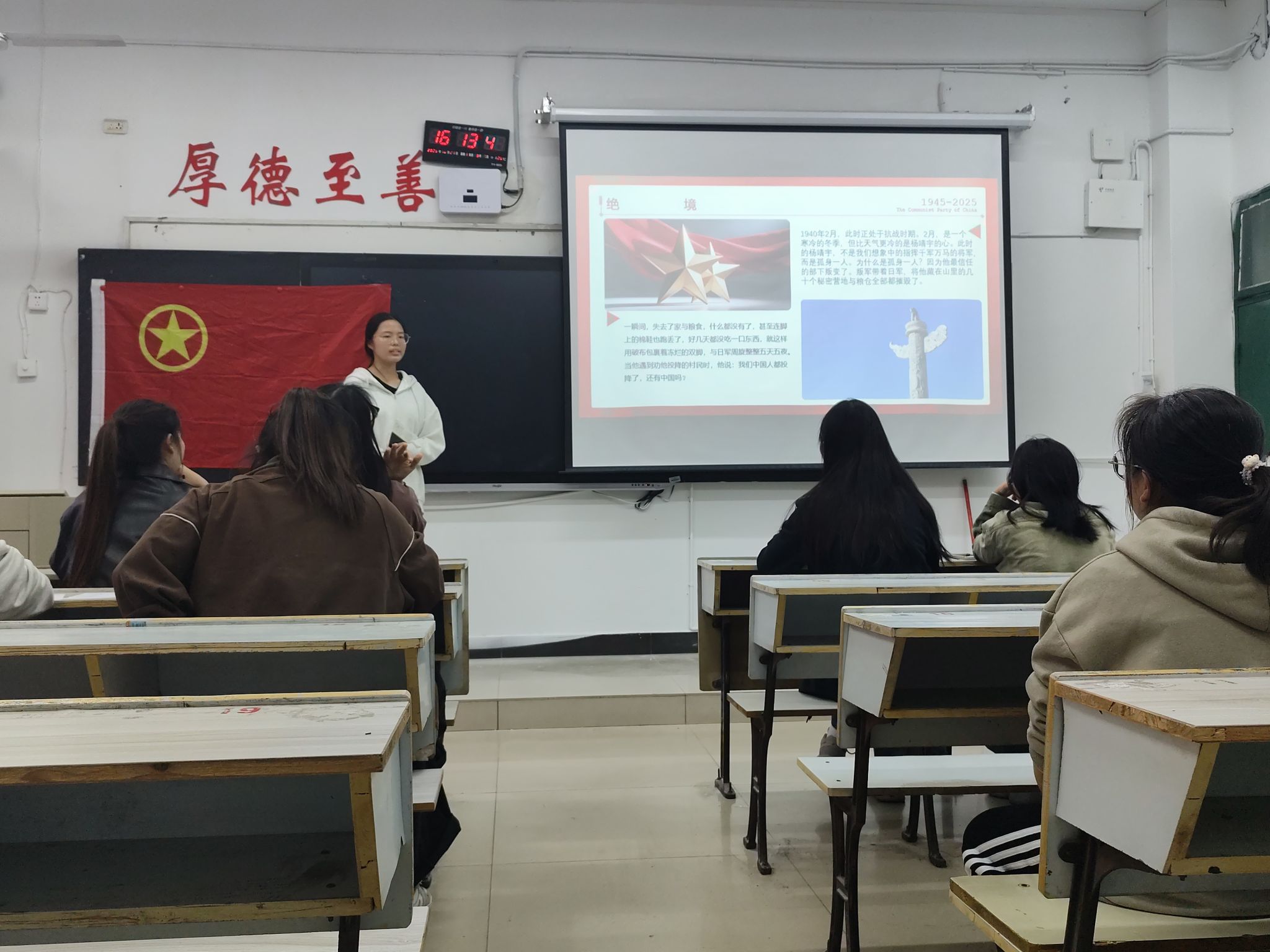大赛过程中,各名青年团员依次上台,将他们为此次大赛做出的准备进行展示,他们站立在讲台中央,身后的PPT里,是革命先烈为保家卫国的光荣事迹,是先辈们的誓死坚守,将先辈“轻伤不下火线”的经历展现的淋漓尽致,让“牺牲与奉献”有了当代注解。他们通过自己的方式,把“革命事迹”转化为“青春共鸣”,让先辈的精神在沉浸式体验中扎根。对参赛者而言,备赛的过程本身就是一场深刻的“红色修行”。从“模糊的历史名词”到“鲜活的人物形象”,从“遥远的革命故事”到“切身的精神感悟”,参赛者们在深挖事迹、提炼精神的过程中,完成了对革命精神的再理解、再认同,也让自己的青春信仰愈发坚定。参赛者用鲜明的图片还原团史片段,让“先辈的坚守”在演讲中直抵人心……这是微团课大赛现场最动人的场景——当青年的思考与时代的命题相遇,当精巧的表达碰撞真挚的情感,这场“小课堂的比拼”,早已超越赛事本身,成为青春思想的盛宴与价值传承的舞台,使台下的观众深深共情。