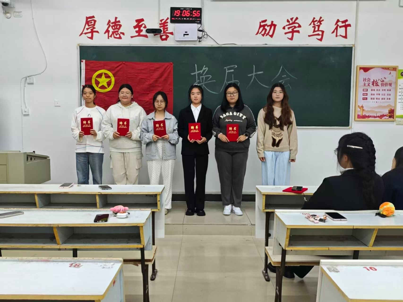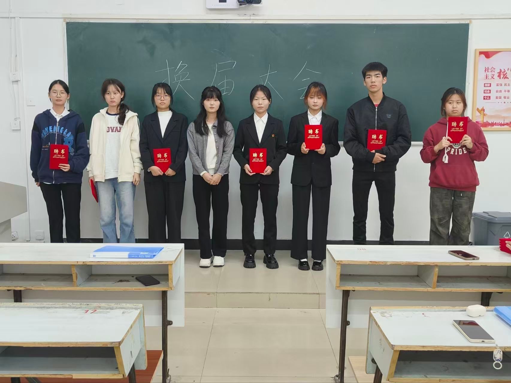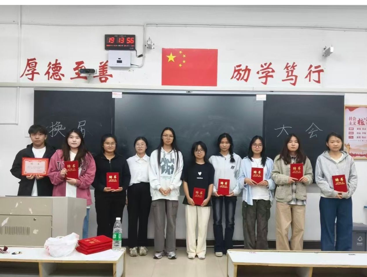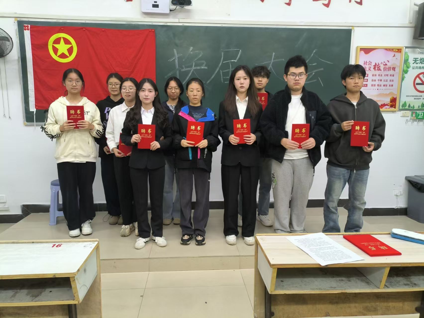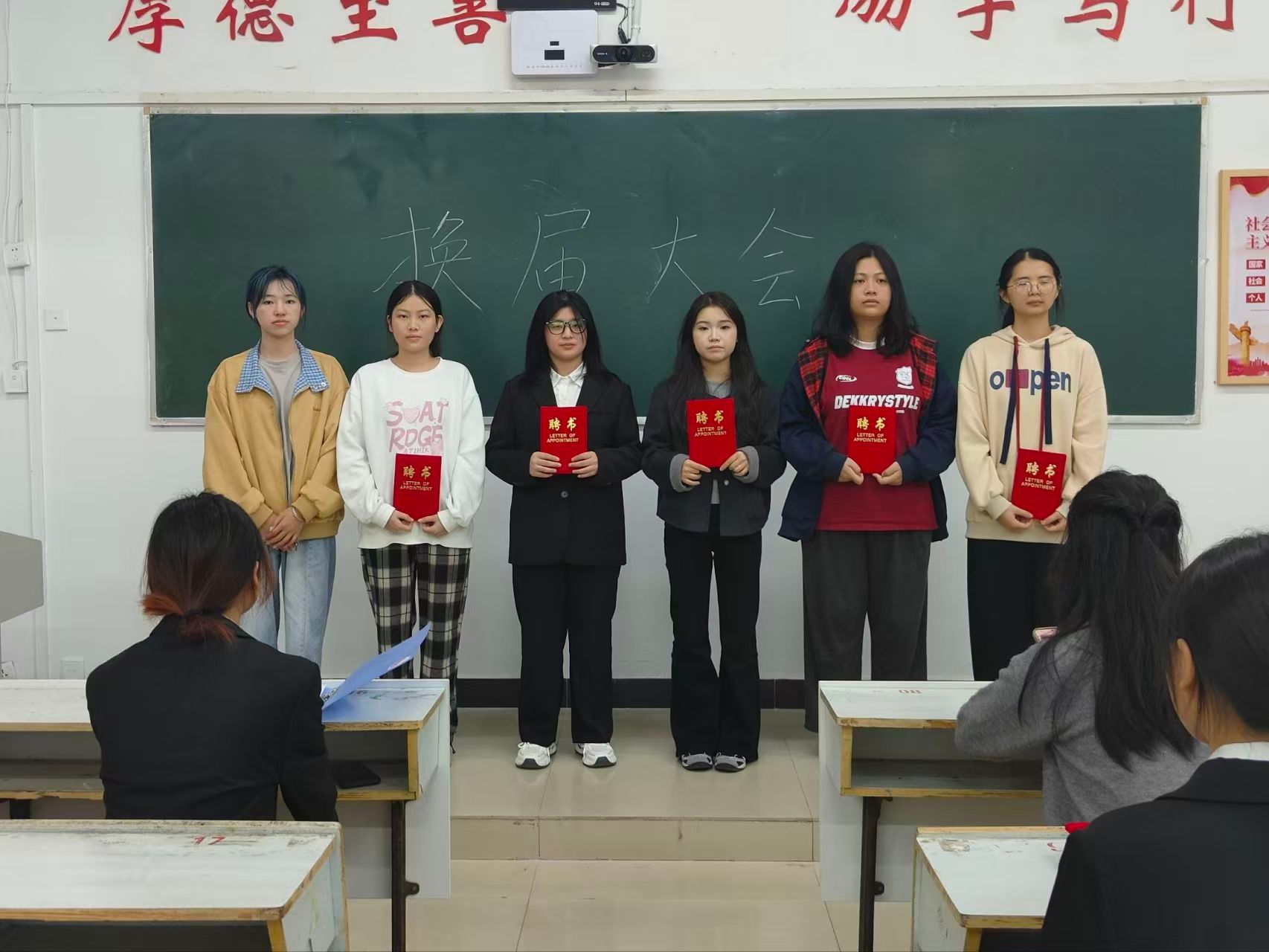 各教室大会在主持人的精彩开场中同步拉开帷幕,主持人介绍了本次活动核心目的——感谢24级部员过去一年的辛勤付出,完成工作平稳交接,并向到场人员表达诚挚欢迎;竞聘环节中,24级竞聘干事依次登台,以饱满热情和清晰思路分享个人经历、阐述对部门工作的理解与未来设想,展现出新时代青年的朝气与思考;接下来是颁发聘书环节,23级部长团成员为24级全体任期一年的部员逐一颁发聘书,以此肯定大家的参与热情与责任担当,各部门部员手持聘书合影留念,定格下意义非凡的瞬间;大会最后,各部门23级部长依次上台讲话,向获得聘书的24级部员表示热烈祝贺,结合共事经历分享工作感悟,衷心感谢24级部员在员工会岗位上的全情投入与不懈坚守,感谢大家用青春热血为部门发展筑牢根基、为员工会建设添砖加瓦,这份付出将成为员工会传承中的珍贵财富。