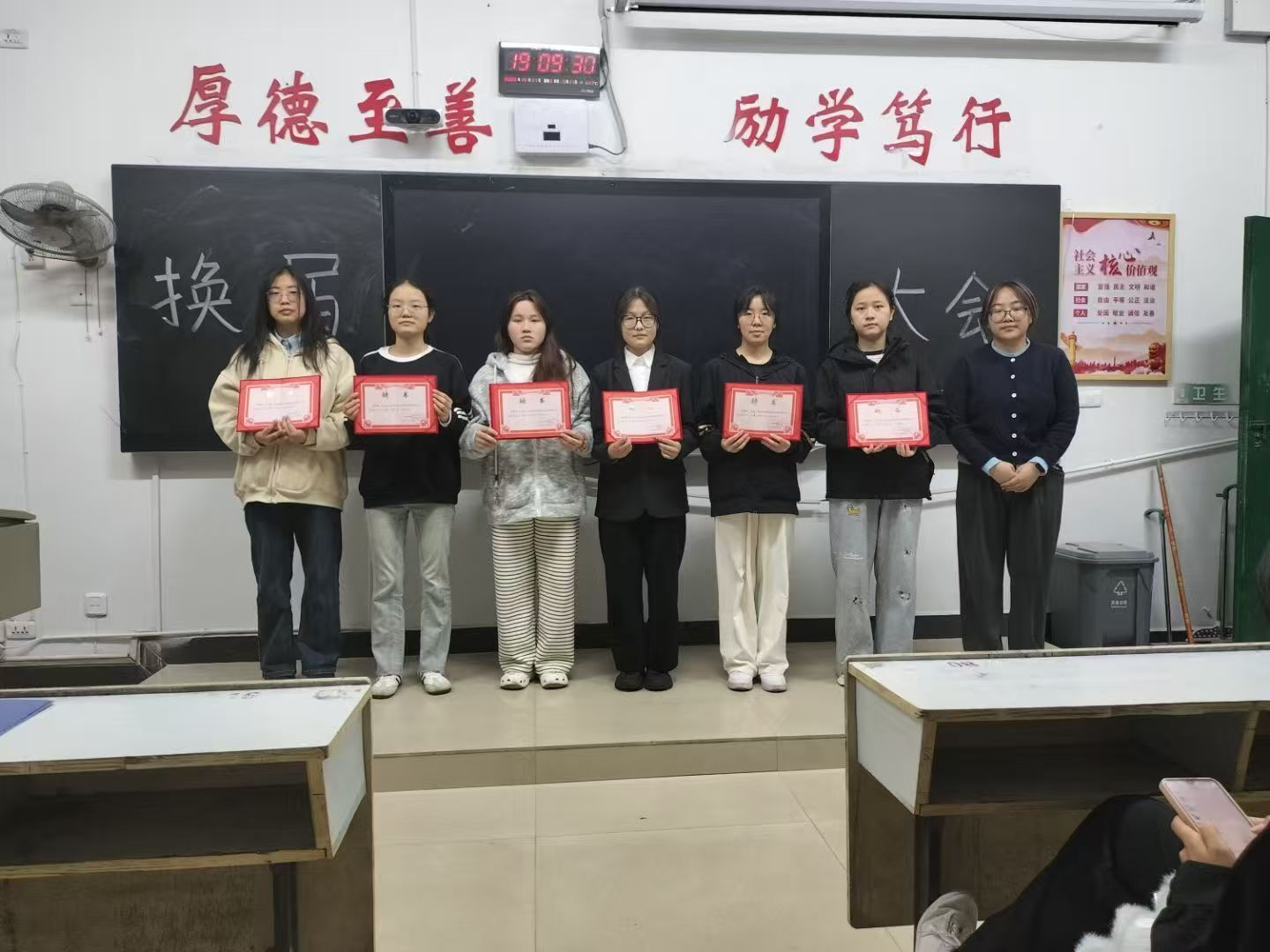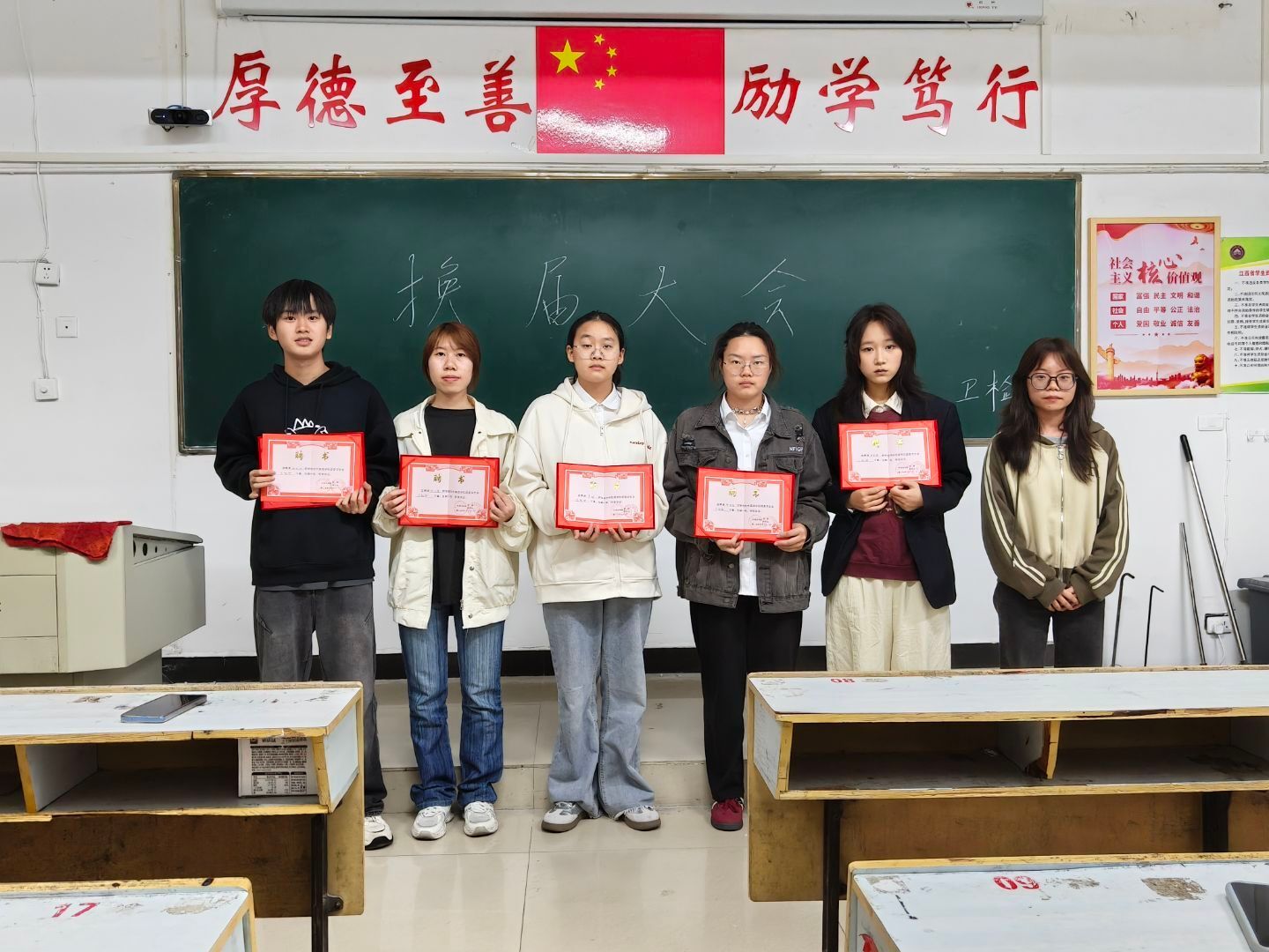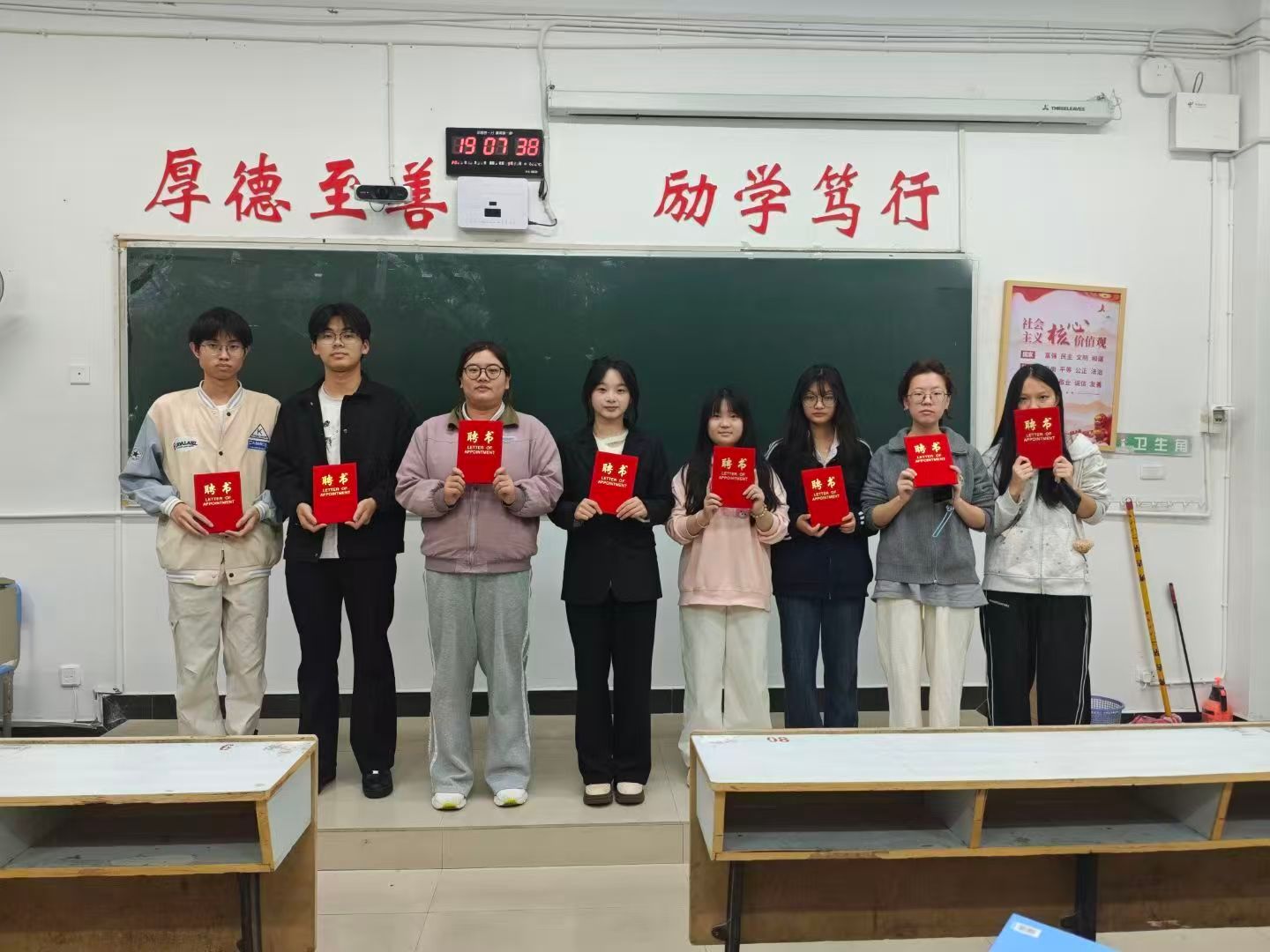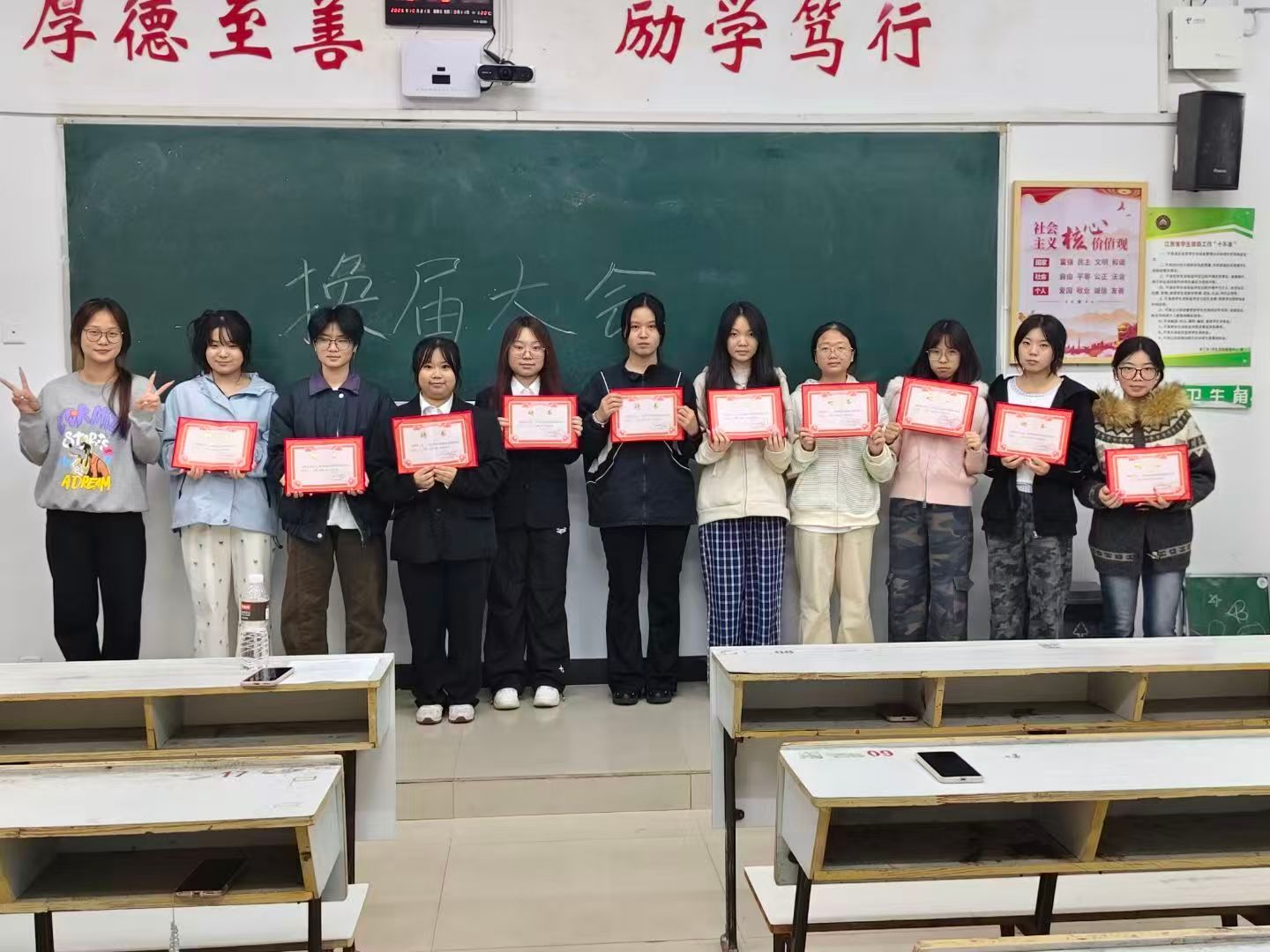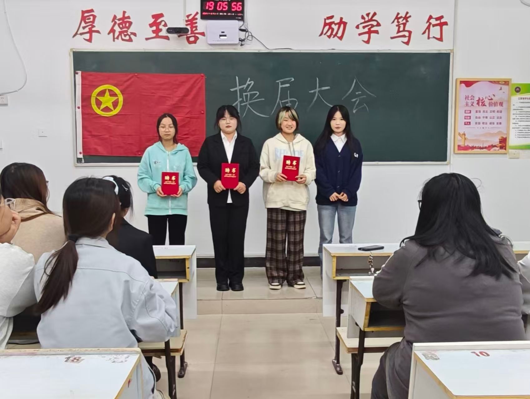 各教室大会在主持人的精彩开场中同步拉开帷幕,主持人介绍了本次活动核心目的——感谢24级部员过去一年的辛勤付出,完成工作平稳交接,并向到场人员表达诚挚欢迎;竞聘环节中,24级竞聘干事依次登台,以饱满热情和清晰思路分享个人经历、阐述对部门工作的理解与未来设想,展现出新时代青年的朝气与思考;接下来是颁发聘书环节,23级部长团成员为24级全体任期一年的部员逐一颁发聘书,以此肯定大家的参与热情与责任担当,各部门部员手持聘书合影留念,定格下意义非凡的瞬间;大会最后,各部门23级部长依次上台讲话,向获得聘书的24级部员表示热烈祝贺,结合共事经历分享工作感悟,衷心感谢24级部员在员工会岗位上的全情投入与不懈坚守,感谢大家用青春热血为部门发展筑牢根基、为员工会建设添砖加瓦,这份付出将成为员工会传承中的珍贵财富。