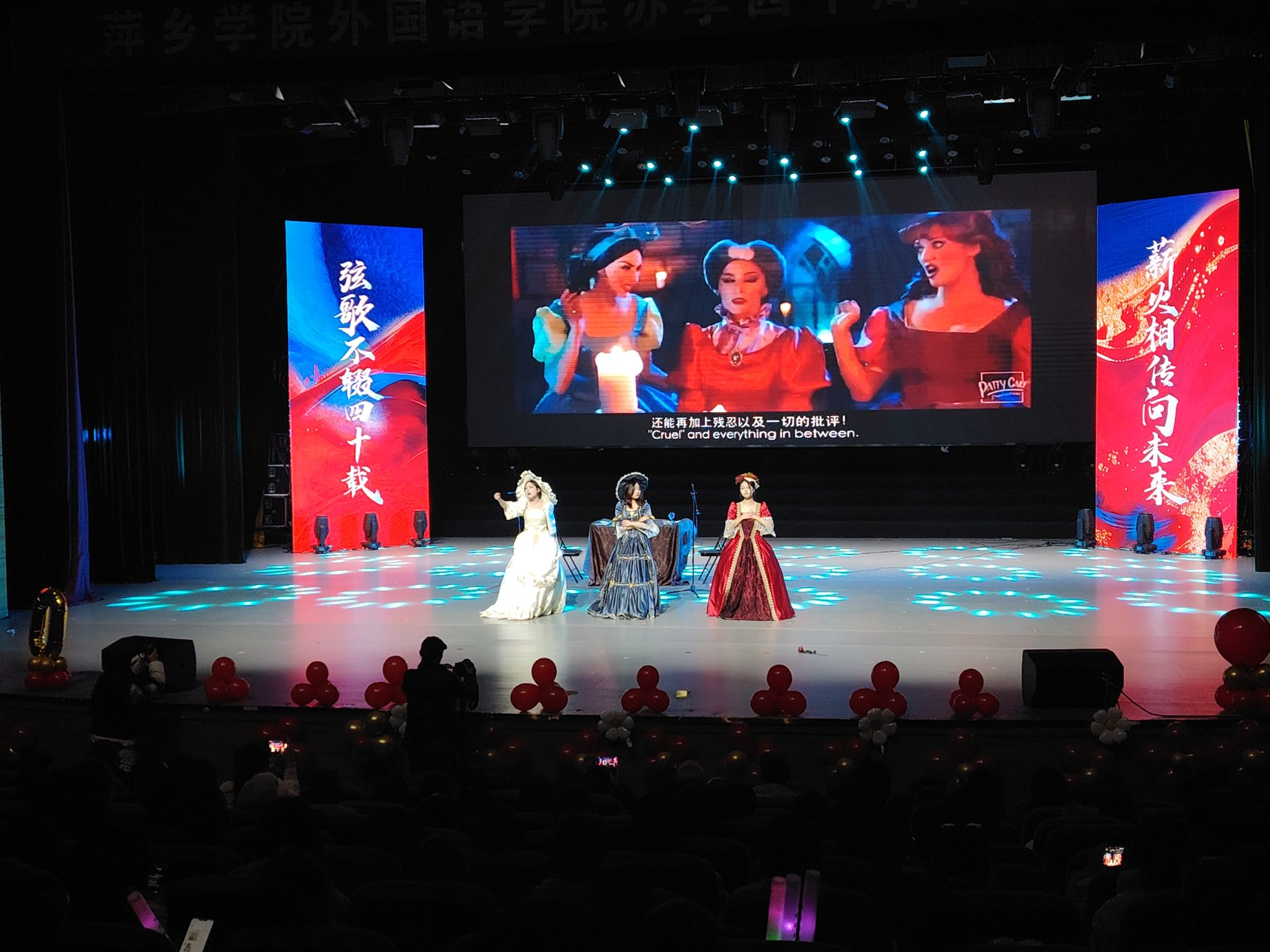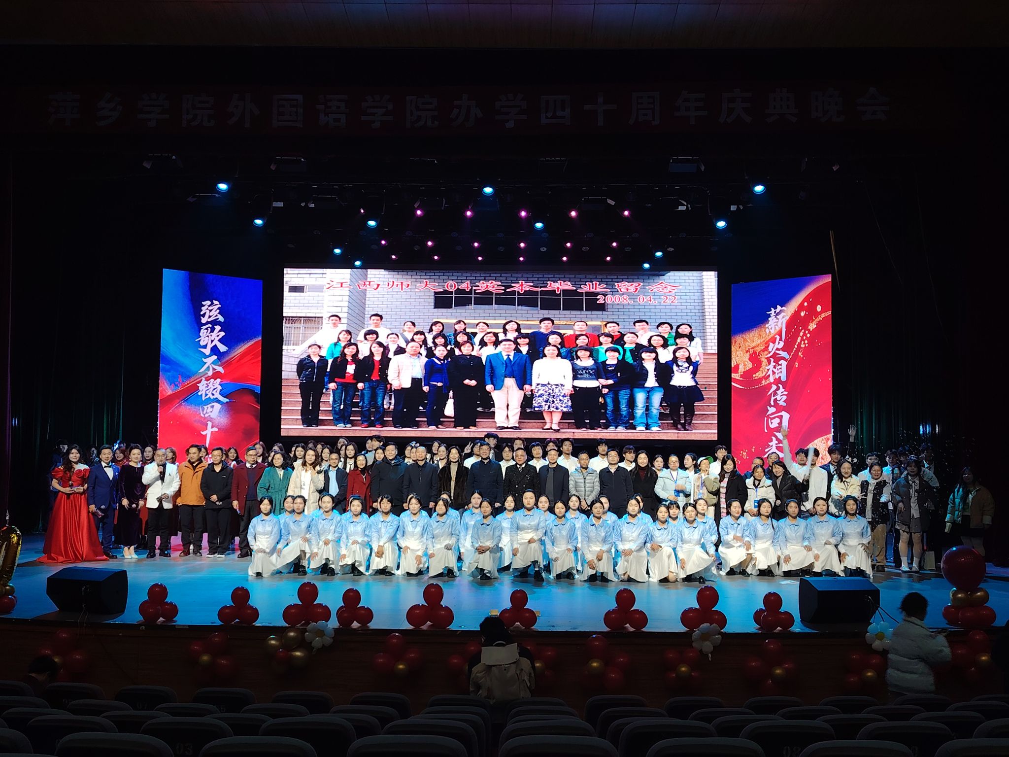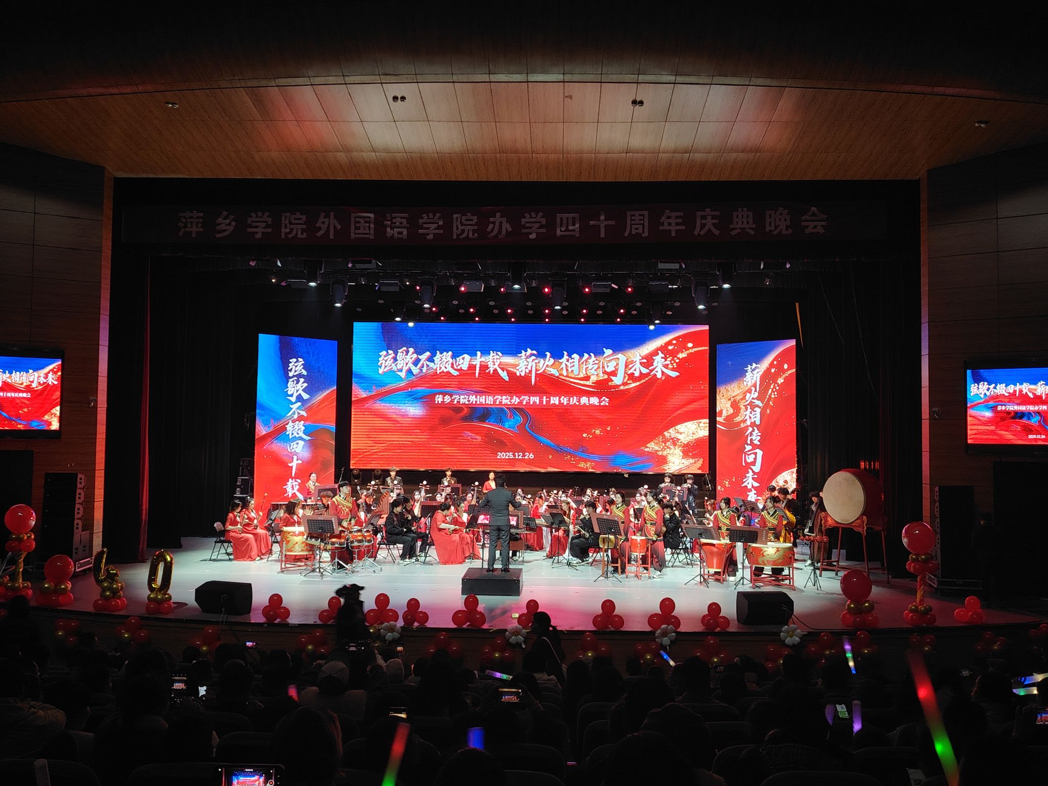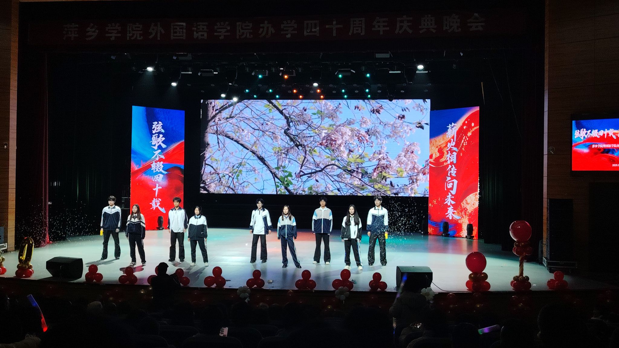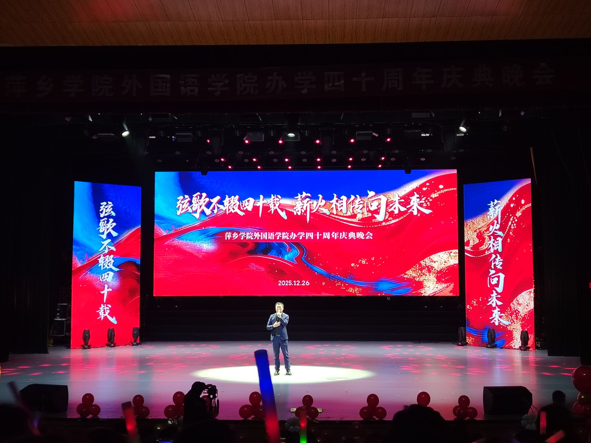 晚会以海怀民乐团带来的器乐演奏《龙腾虎跃》激昂开场,雄浑的乐声瞬间点燃现场氛围。演奏结束后,beats365亚洲版官网经理欧阳咏梅登台致辞,她代表学院向到场嘉宾、师生及员工致以热烈欢迎与诚挚感谢,庆贺学院办学40周年,回顾办学成果并寄语师生续写外语教育新篇章。致辞结束后,精彩节目轮番上演。彭东方带来的独唱《我爱你中国》满含家国热忱,张万明等师生的朗诵《四秩弦歌·外语芳华》深情回溯学院四十年办学历程,江依敏等人演绎的爵士舞《zoo》展现出外语学子的青春活力;易国华、彭利萍老师带来的萍乡春锣《团圆饭》展现了萍乡地区浓厚的文化底蕴,陶志华等员工的英语配音《绿皮书》《后妈的茶话会》尽显专业功底,陈阿马与荣玲的歌曲对唱《有一点动心》又添温情,萍乡二中员工的舞蹈《如愿》传递出跨校情谊;彭雅稚等师生的外语歌曲串烧《声载光阴》、李丽雯等人的模特秀《时光长廊·衣路同行》创意十足,郭建辉、张雯琪领唱的民歌小组唱《五指山歌》《万泉河水清又清》唱响红色旋律,余丽雪等同学的啦啦操《青春跃动》点燃全场氛围,最终晚会在大合唱《友谊地久天长》的悠扬旋律中落下帷幕。演出期间还穿插了三轮互动抽奖,将现场欢乐氛围一次次推向高潮。所有节目表演完毕后,到场嘉宾与全体表演人员一同合影留念,定格下这一美好时刻。