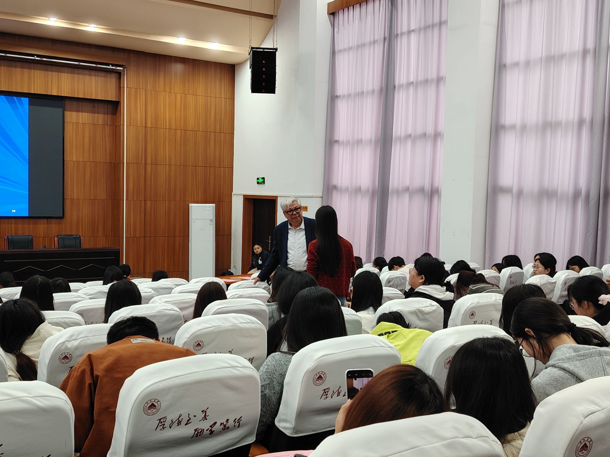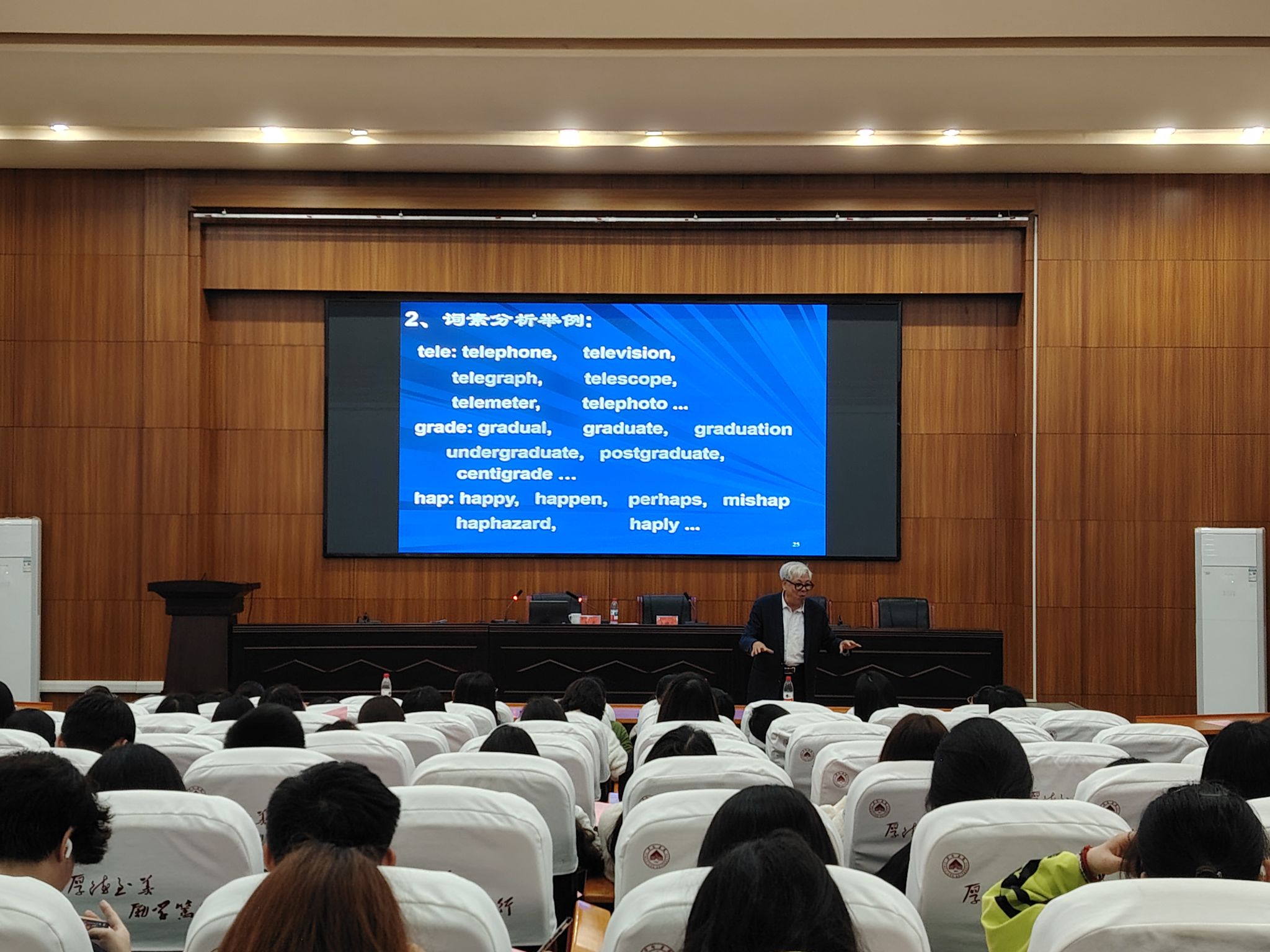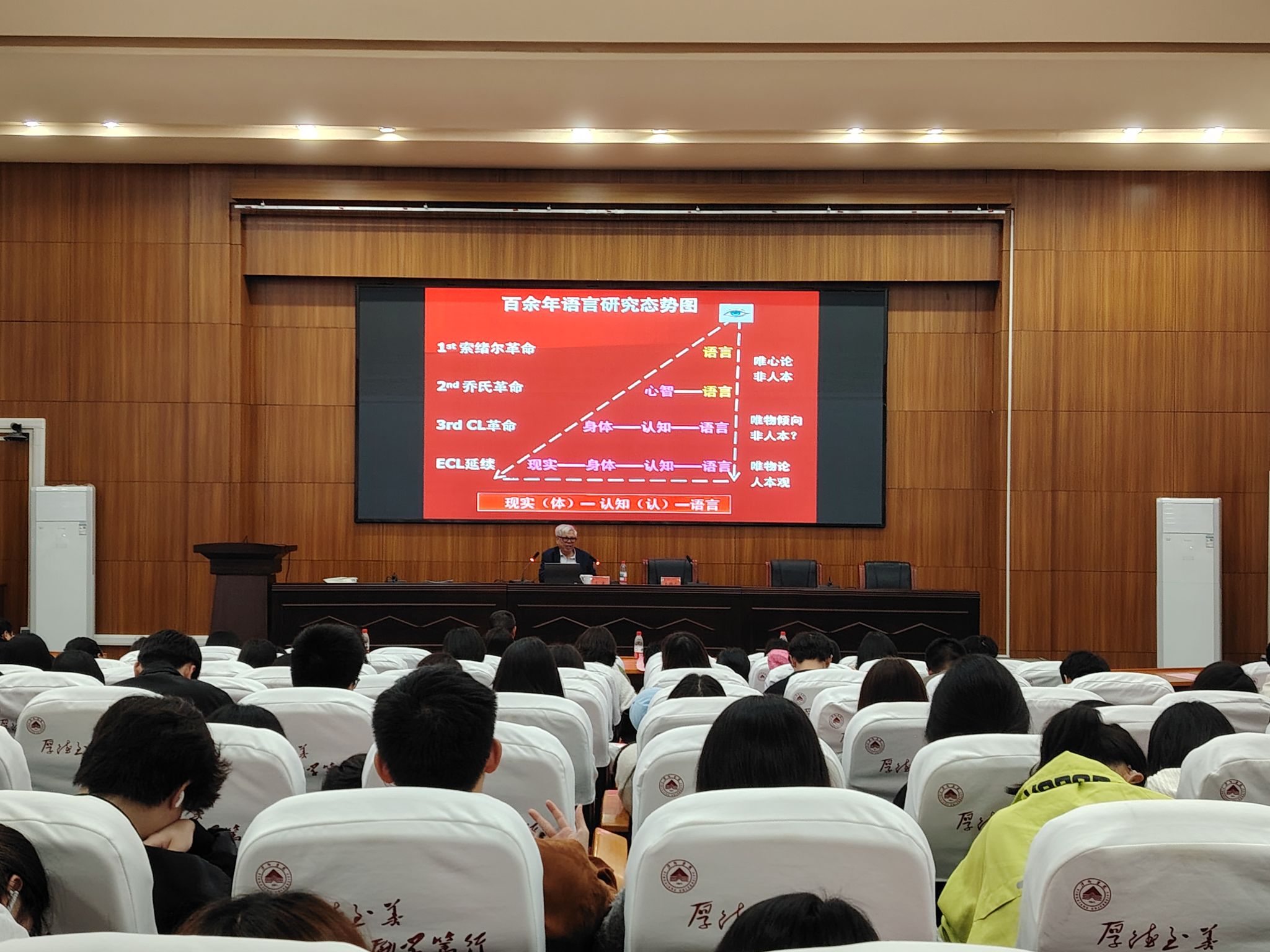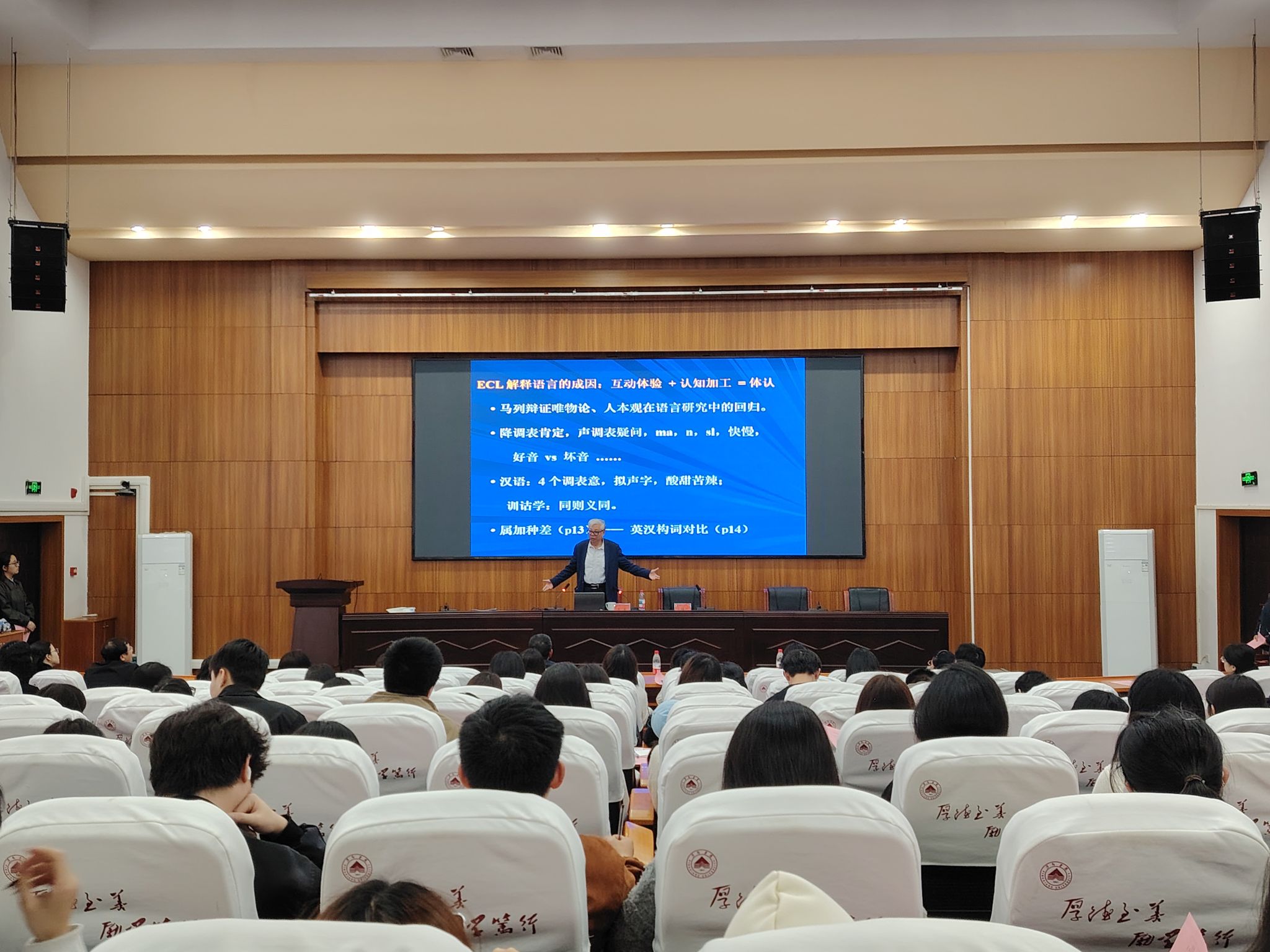 讲座伊始,beats365亚洲版官网经理欧阳咏梅老师向全体师生隆重介绍王寅教授,对教授及其夫人的莅临表示热烈欢迎与诚挚感谢。介绍完毕后,欧阳经理宣布讲座正式开始。本次讲座中,王寅教授主要围绕两大核心内容展开深入分享。第一部分聚焦“为什么学习语言学”,王教授以《蒙娜丽莎的微笑》为例,从画作深意切入引出“人的价值”这一话题,再结合动物行为分析对比,点明人类与动物的本质区别在于独有的语言能力,从而凸显了语言学学习的独特意义;第二部分围绕“怎样学习语言学”展开,王教授深入讲解体认语言学的核心观点,通过汉字与英文构词的深度对比展开阐释——从汉语“单独使用的字、偏旁部首”,到英语“单词(根词)、粘着词素”的层级差异,以“人/man/anthrop-”“水/water/hydro-”等成对词汇为例,再结合“牛、猪、羊、鸡、马”等动植物相关词汇的汉英对应表达,以及“scr-、fl-、gl-”等英语词缀的语义逻辑,生动讲解体认语言学核心观点,结合英语词汇学习实例,将抽象理论与实际语言运用相结合,帮助师生直观理解理论落地方法。讲座过程中,教授还带领大家开展互动练习,让同学们现场体验理论分析的思路与技巧。讲座尾声,同学们踊跃提问,王寅教授逐一耐心解答,现场互动氛围热烈。欧阳经理在总结中表示,本次讲座既有哲学高度、理论深度,更有实践温度,充分展现了王寅教授数十年深耕语言学领域的深厚素养与学术担当,让在场师生收获满满、深受启发。