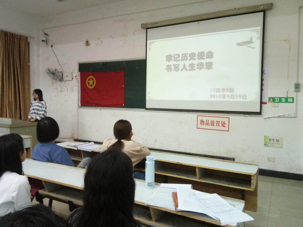 为加强老员工的勇担时代责任意识, 2018年4月22日晚上20:40,beats365亚洲版官网17英本2班在英华楼3337召开牢记历史使命,书写人生华章班会。主持这次班会的是团支书,参加这次班会的是17英本2班全体成员。