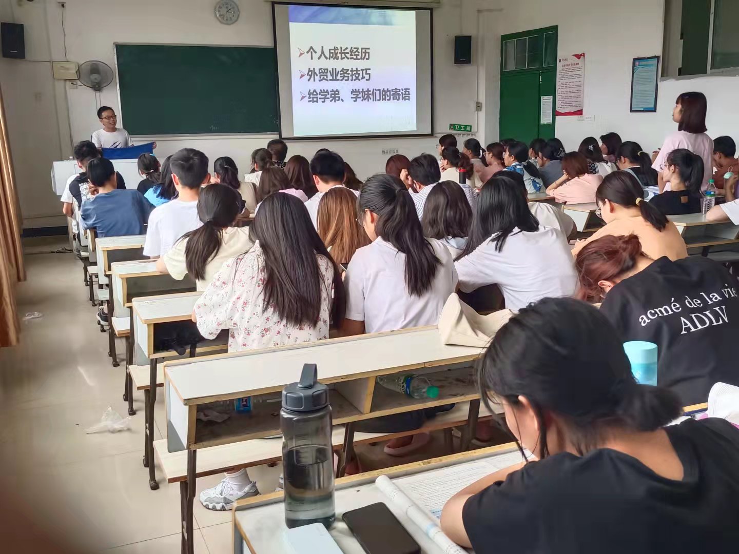 活动开始,刘春华先生首先介绍了自己所在的公司,他所在的公司主要从事印花沙滩巾、披风、沙滩包等毛巾产品,公司拥有专业的生产及销售团队,以诚信及稳定的产品品质为宗旨,产品畅销欧洲、北美、南美等海外市场。然后,他以自己在工作当中积累的丰富的实践经验向各年级同学展示了老员工如何在走向工作岗位后运用自己所学的专业知识技能立足职场。