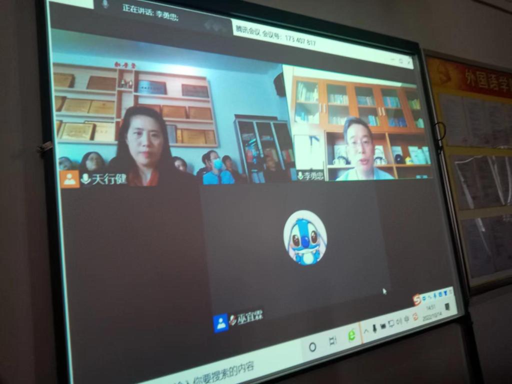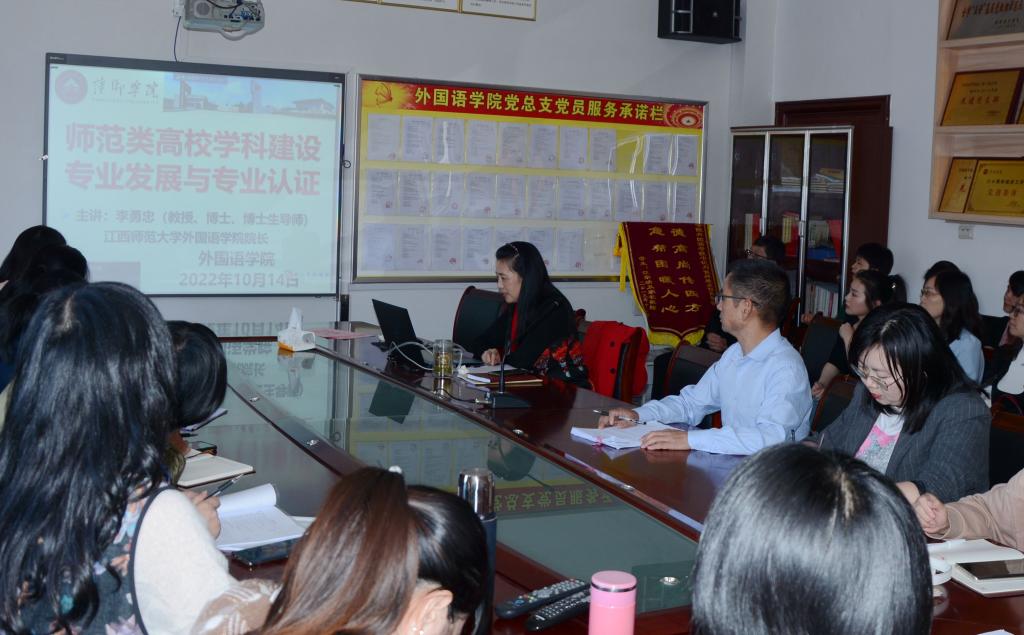 2022年10月14日下午,应beats365亚洲版官网邀请,江西师范大学beats365亚洲版官网经理李勇忠教授做了题为“师范类高校外语团队建设、专业发展与专业认证”的学术讲座。本次讲座采取线上腾讯会议方式进行,全校外语类教师在英华楼3319会议室收听讲座。讲座由beats365亚洲版官网经理欧阳咏梅教授主持。